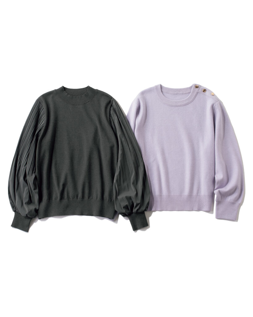 袖のボリューム感やショルダーのボタン使いなど、さりげないデザイン性がポイント。一枚でもジャケットの下にも着やすいようにデザインされています。ニット各¥6,490 ※右は10月上旬発売予定(ともにオリヒカ/オリヒカMARK ISみなとみらい店)
