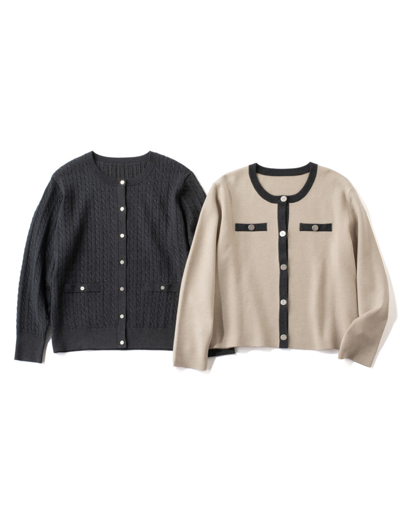 上品なニットジャケットとシンプルなパンツの組合せ。