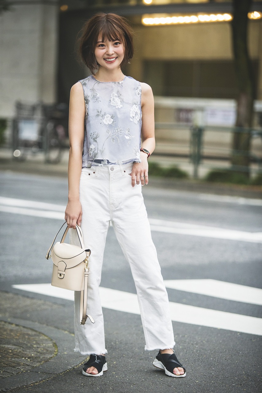 クッション性が良くてスニーカー感覚で楽に履けるハラチは、あえてきれいめな白デニムコーデと合わせます。スニーカーに比べて抜け感があるから、足元が重たくなりすぎないのがポイント。丈短デニムとハイウエストデニムの組み合わせは、それだけで脚が長くスタイルアップして見えるので、スポサンを履くときにもおすすめです。(梅沢ひかりさん メーカー勤務・165cm )