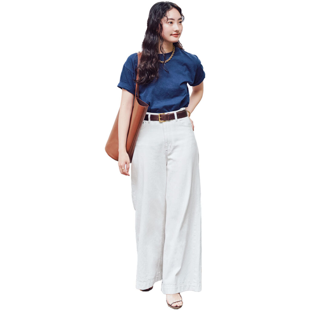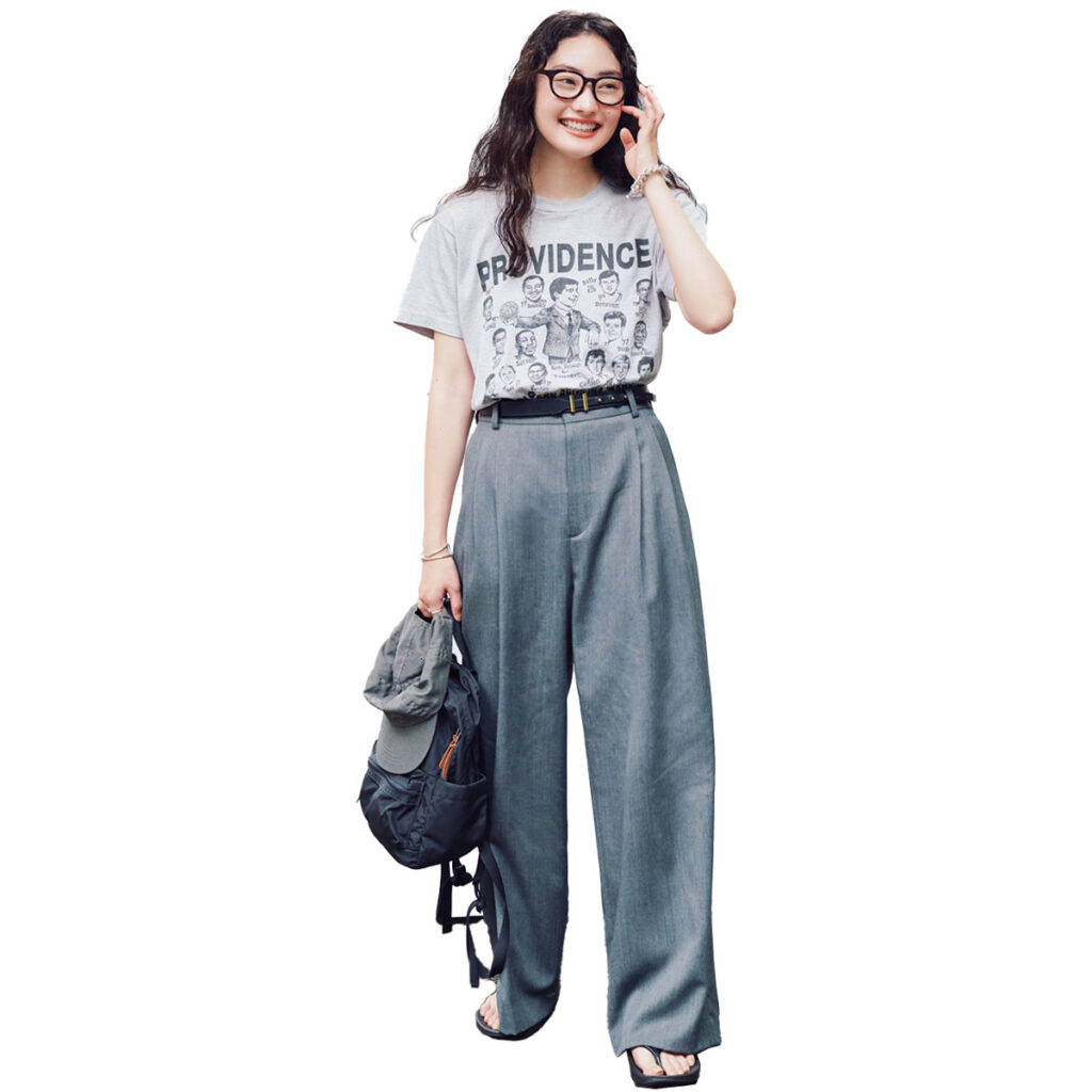 服はほぼプラージュですが、アクセントに古着を入れて個性を。古着のTシャツはサイズが合わないものも多いので、ぴったりなものを見つけたら運命と思って即ゲット(笑)。