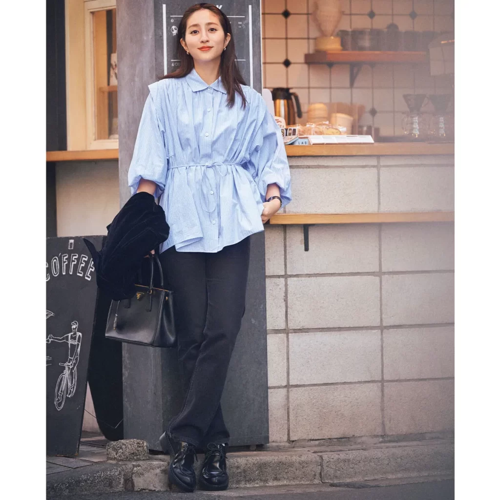 インスタで私服がおしゃれと話題の堀田茜ちゃんが、ご主人のご家族に初めて会う日に着たコーデを再現。デザイン性の高い青シャツに黒デニムを合わせたキレイめな着こなしです。シャツが主役のコーデだから、バッグとシューズも黒でまとめてあくまでシンプルにするのが正解。