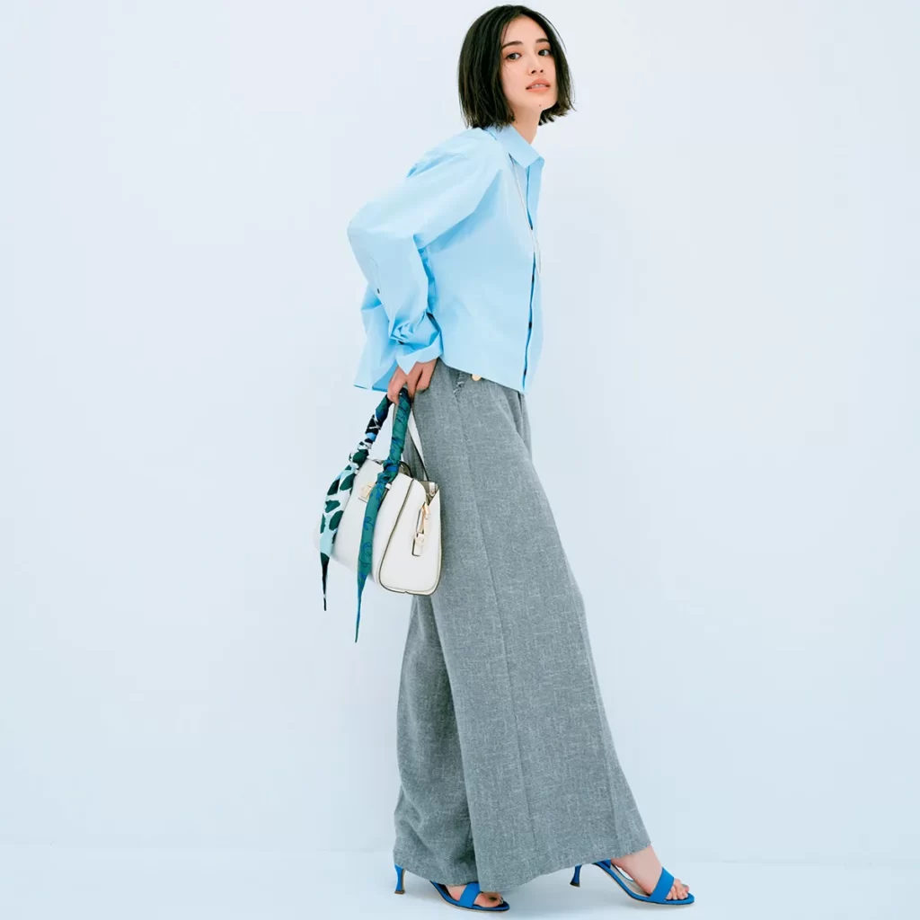 ブルーシャツ×グレーパンツも失敗知らずの定番配色。爽やかな淡い色合いは、春の柔らかな日差しに映えます。ワイドパンツを選ぶなら、シャツはショート丈がバランスよく決まっておすすめ。ハイウエストで腰位置を高くマークして、お腹チラリ回避と脚長効果を狙ってみて。