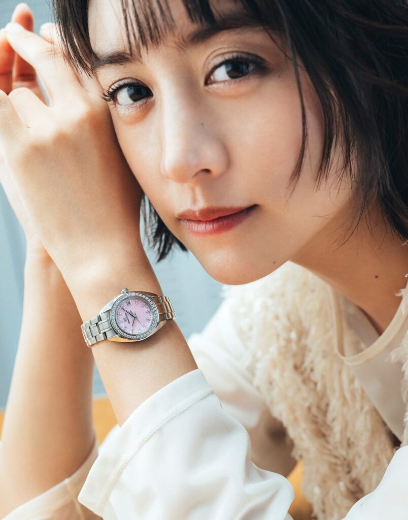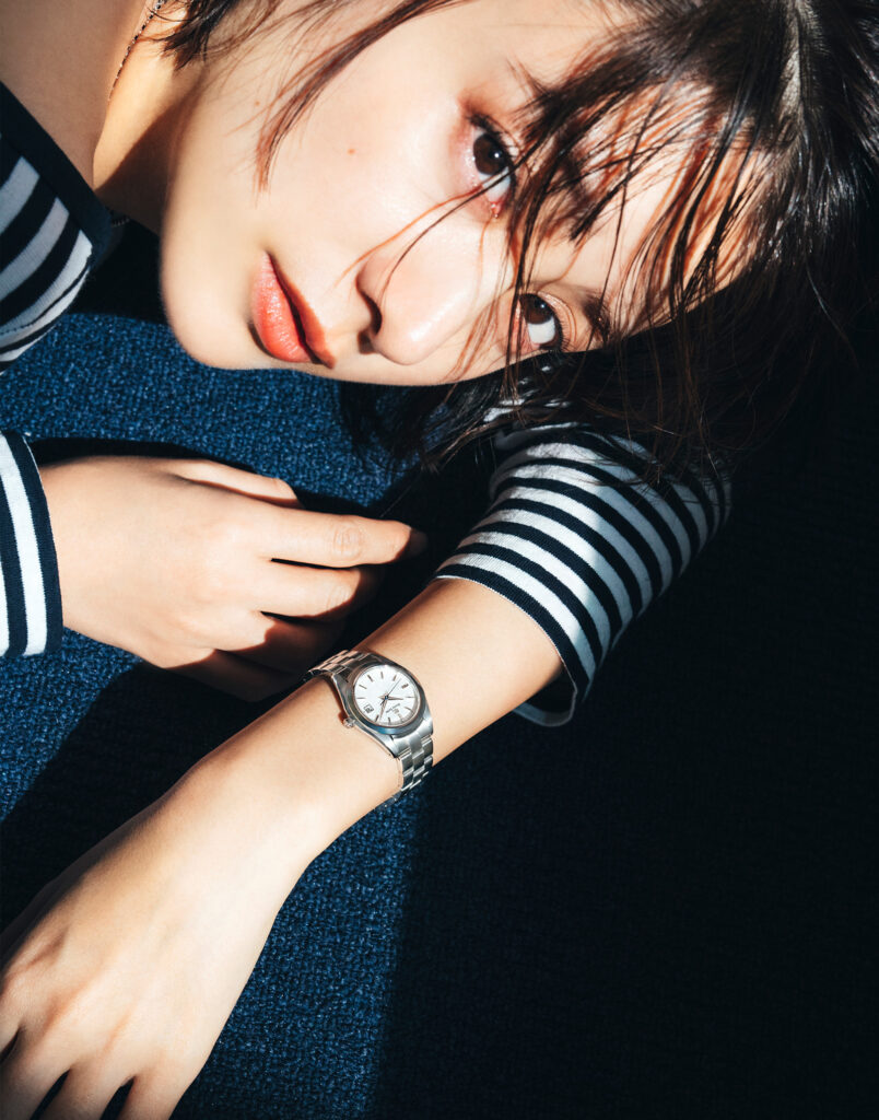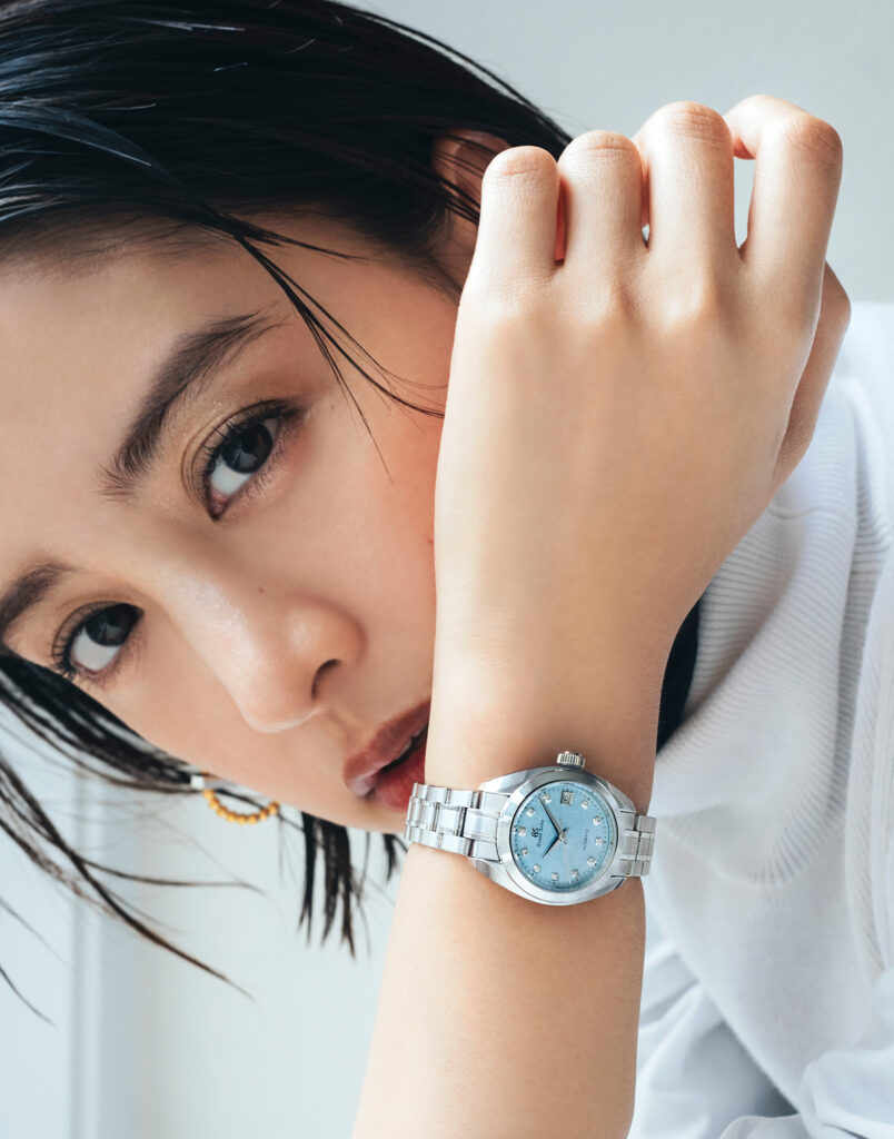 世界最高レベルの高精度メカニカルムーブメントを女性の腕になじむコンパクトなシルエットに設計。みずみずしい透明感のあるブルーのダイヤルには、絹のような型打模様が。存在感はあるのに飽きのこない洗練されたデザインは、シンプルな白シャツコーデを一気にクラスアップ。