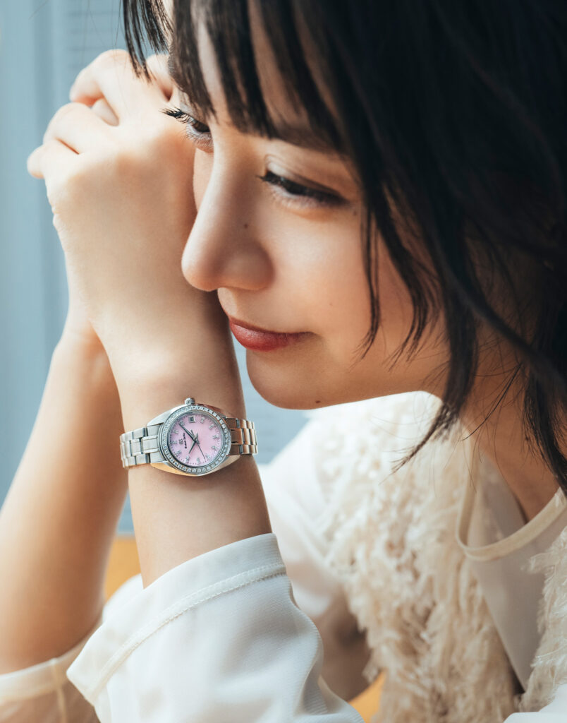 ひとつとして同じ色のない白蝶貝のダイヤルは、大輪の「芍薬」を想起させる華やかさ。40個ものダイヤがぐるりとケースに施され、着ける人をひときわ品よく、愛らしく導いてくれます。肌になじみやすい優しいピンク色のダイヤルは、合わせるコーデを選ばず、どんなスタイルにもマッチ!