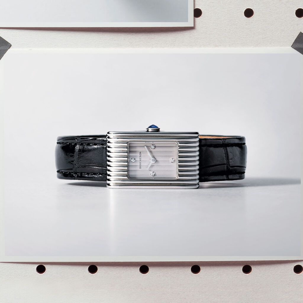 長方形のケースに施す縦縞模様が印象的な、大人のためのジュエリーウォッチ。時計「リフレ ウォッチ スティール スモール」〈SS×D×パテントカーフ ケース29.5×18㎜ クォーツ〉¥572,000(ブシュロン/ブシュロン クライアントサービス)