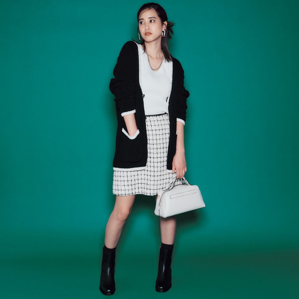 コンサバ見えバランスをブーツでキリリと。ミニスカート¥5,489(ロペ ピクニック)カーディガン¥39,600(アダワス/ショールーム セッション)タンクトップ¥10,450(ルージュ・ヴィフ/ルージュ・ヴィフ ラクレ ルミネ有楽町店)バッグ¥27,500(ロウェル シングス/アバハウスインターナショナル オンラインストア)ソックス¥1,210(Tabio/タビオ)ブーツ¥36,300(ユナイテッドアローズ/ユナイテッドアローズ 渋谷スクランブルスクエア店)イヤリング¥8,800ネックレス¥21,000(ともにアビステ)