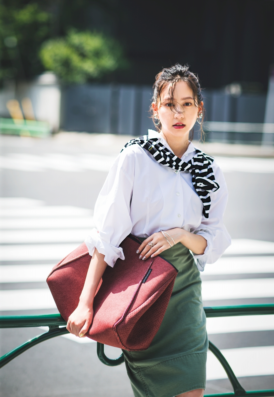 カットソー¥11,000(ルミノア/ゲストリスト)シャツ¥37,000(フィナモレ/フレームワーク ルミネ新宿店)スカート¥32,000(マディソンブルー)バッグ¥46,000※9月発売予定・梅田阪急先行(ステート オブ エスケープ/サザビーリーグ)イヤリング¥12,000(ビジューラウンジ/ビジューラウンジ 新宿髙島屋店)ブレスレット¥5,000(マージョリー・ベア/ココシュニック オンキッチュ 有楽町マルイ店)リング¥22,000(ココシュニック)