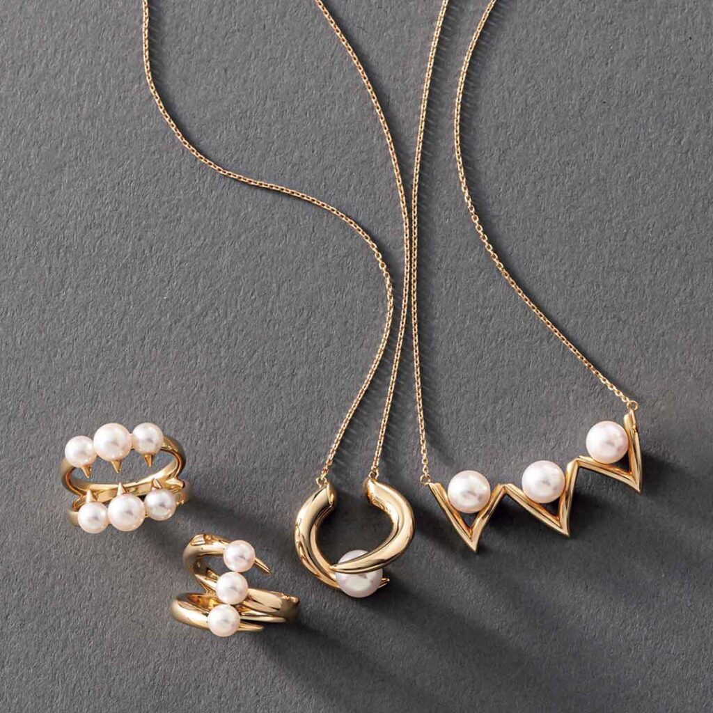 秘めたエネルギーを感じる革新的な美しさ。右から「デインジャー クロウ ネックレス」〈YG×あこや真珠〉¥429,000「デインジャー ホーン ノーベル ネックレス」〈YG×あこや真珠〉¥605,000「デインジャー ファング リング」〈YG×あこや真珠〉¥409,200「デインジャー シグネチャー リング」〈YG×あこや真珠〉¥414,700(すべてTASAKI)