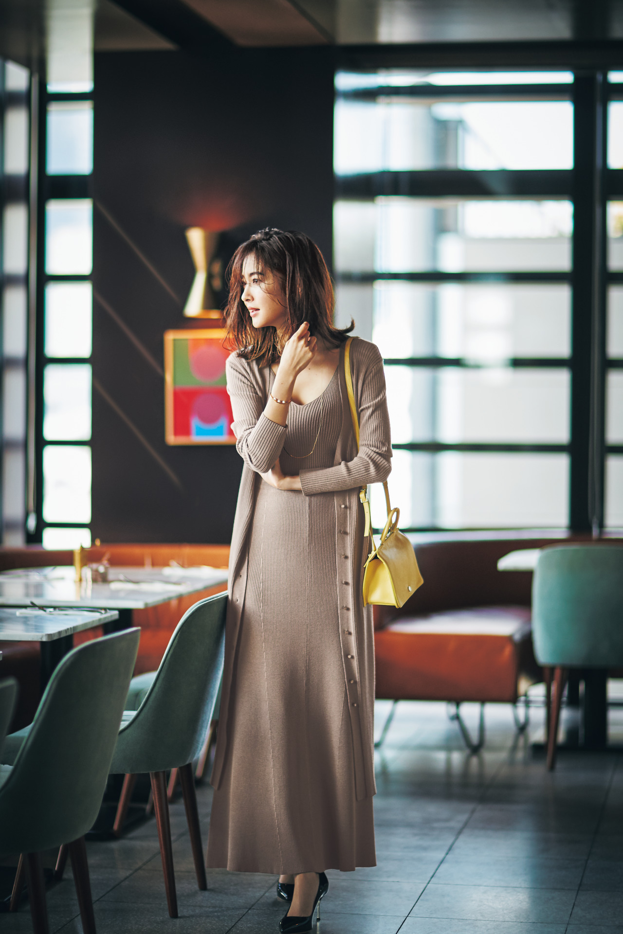 上品なグレージュニットに鮮やかなカラーパンツで遊び心を取り入れて。カーディガン、キャミソール(右ページと同じ)パンツ¥17,000(ルーニィ)バッグ¥16,000〈マルシェ〉スカーフ¥16,000〈マニプリ〉(ともにフラッパーズ)シューズ¥35,000(レペット/ルック ブティック事業部)ネックレス¥2,800(アネモネ/サンポークリエイト)ブレスレット¥5,000(ナイン/ココシュニック オンキッチュ 有楽町マルイ店)