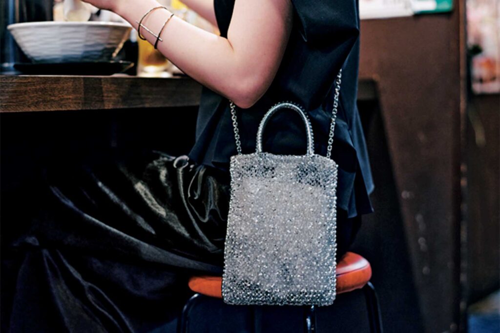 ご近所ならではのラクな真っ黒、手抜き感を見事に払拭してくれるのがキラキラショルダー。カウンターでラーメン!も絵になる、オシャレ心を託せるバッグはご近所残メシの名脇役!