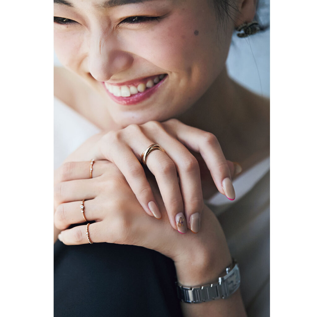「トリニティ」自体に存在感があるので他は主張を抑えたリングでまとめ、両手のバランスを整えます。大好きなピンキーリングも欠かせません。仕上げに、タンク フランセーズでお仕事モードに引き上げるのがマイルール。
