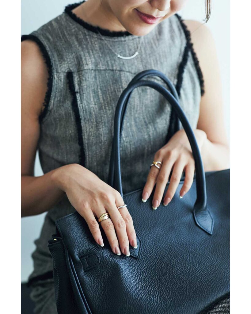 シルバージュエリーと合わせる日は3色のうち、ホワイトゴールドが目立つようにセット。セレクトショップで見つけた地金リングは2つまでに厳選、あくまでも「トリニティ」を引き立たせるのがポイントです。