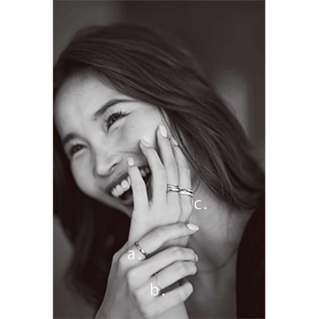「トリニティ」を中指につけたら、あとは韓国、ドバイで購入したプチプラリングをレイヤード。毎日一緒で相棒的存在の「トリニティ」を中心に、旅先で出合ったリングをミックスして作る手元が私らしくて気に入っています。