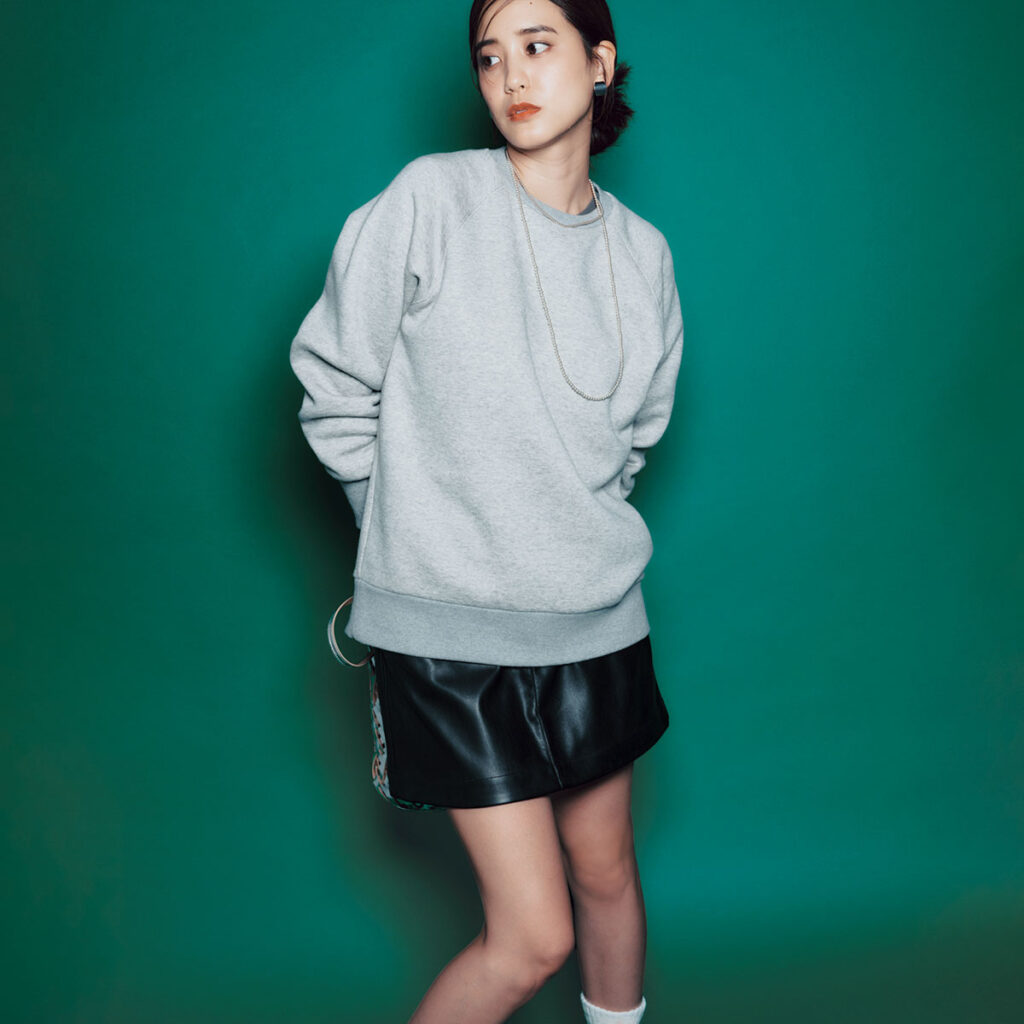 スウェットと合わせた、真似しやすいエフォートレスカジュアル。ミニスカート¥6,990(Gap)スウェットトップス¥26,400(スリードッツ/スリードッツ表参道店)タンクトップ¥14,300(エイトン/エイトン青山)バッグ¥39,600(メアリーオルターナ/アルアバイル)ソックス¥1,320(Tabio/タビオ)イヤリング¥2,700(アビステ)ネックレス[短]¥25,080バングル¥62,480〈ともにバルブス〉ネックレス[長]¥46,200〈アルポ〉(すべてZUTTOHOLIC)