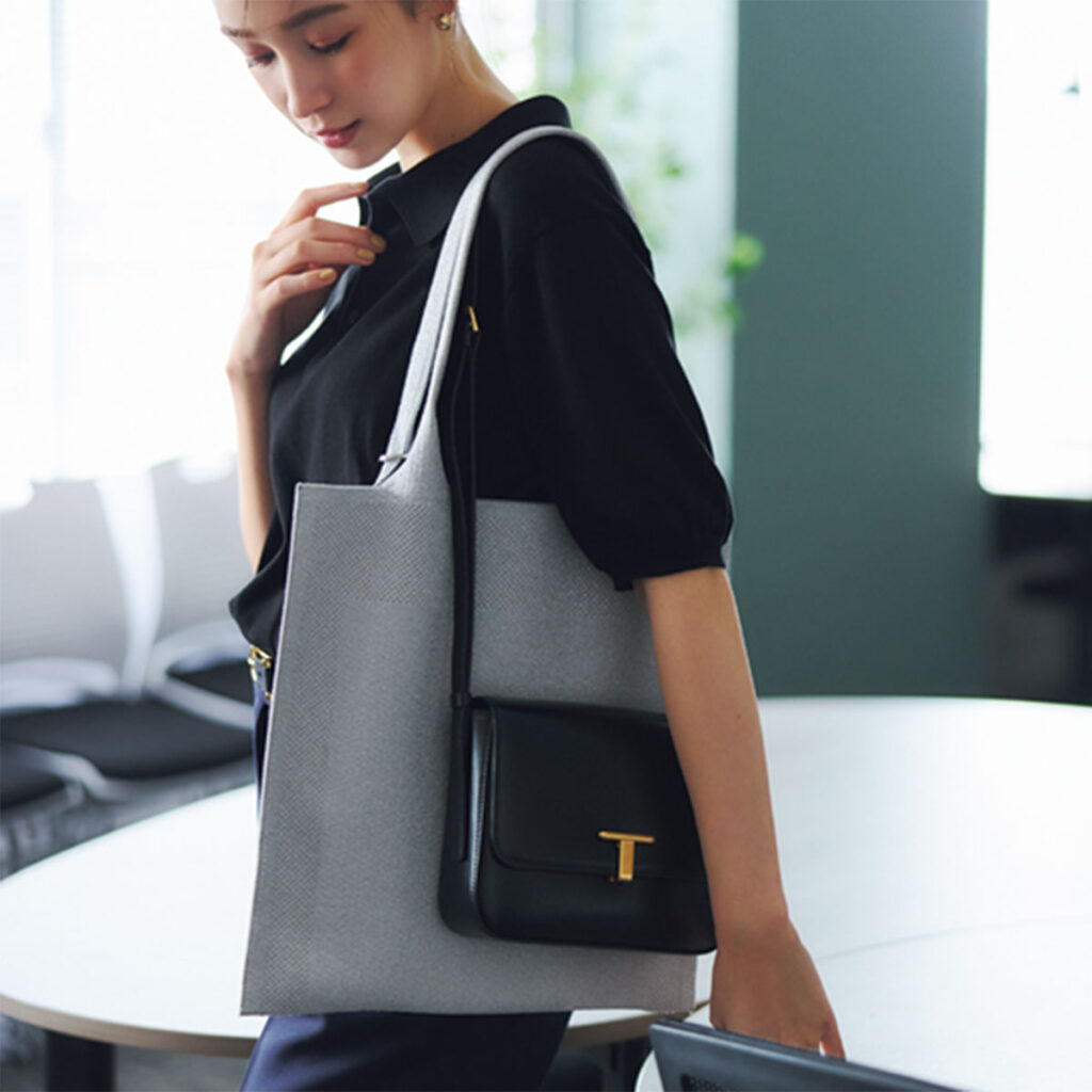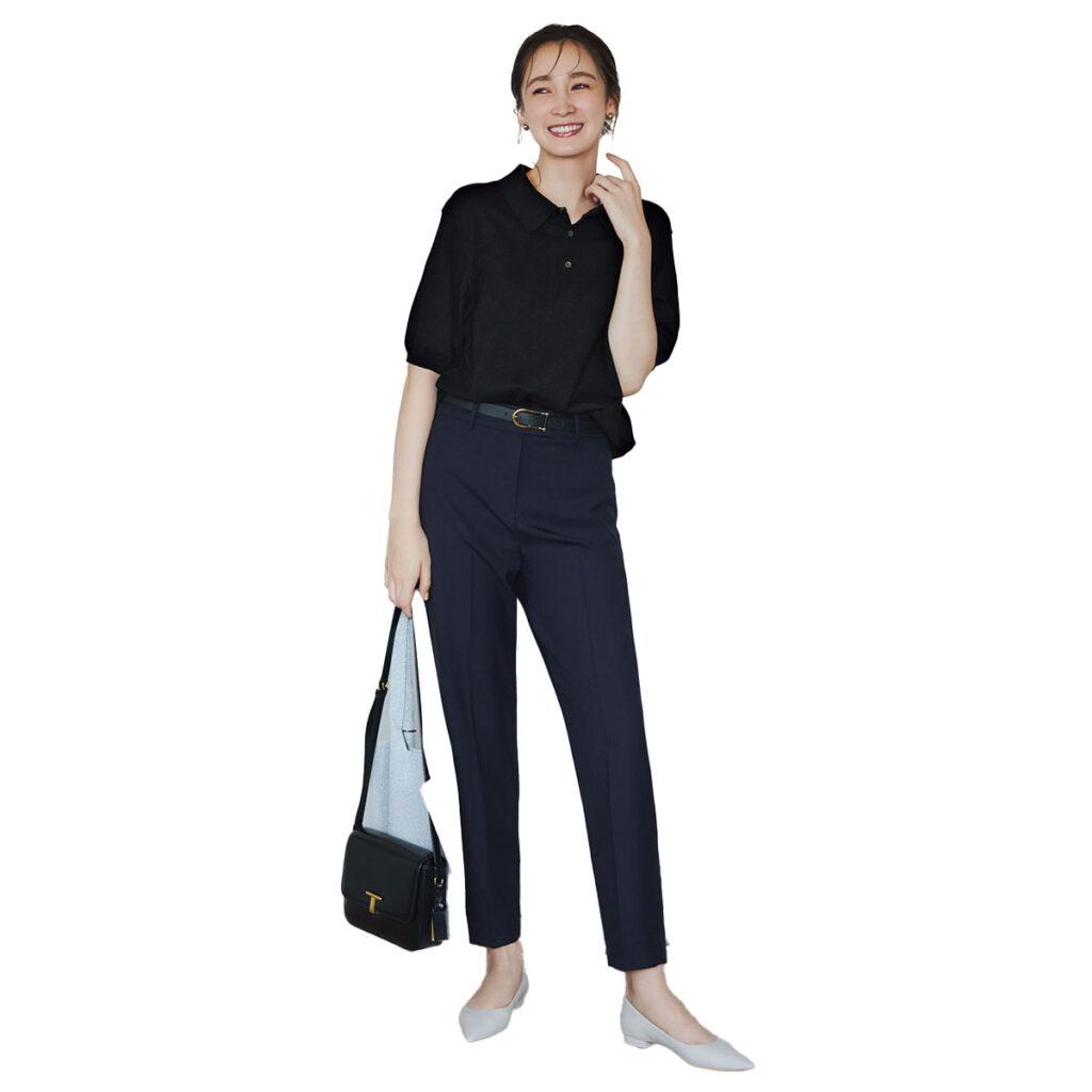 上下ともにジャストサイズだとスポーティ感が出てしまうポロニットは、ゆとりを持たせたサイズ選びが肝。ミニバッグに名刺入れを忍ばせれば、挨拶もスマートに。ニット¥27,500※サイズ5着用(スローン/ザ ショップ スローン 新静岡セノバ店)パンツ¥23,000(バナナ・リパブリック)ピアス¥15,400(プラス ヴァンドーム)ベルト¥12,100(レフィエ/アンタイトル)バッグ¥59,400(ジョイ・グライソン/アルアバイル)サブバッグ¥15,400(アンテプリマ/ワイヤーバッグ/アンテプリマジャパン)パンプス¥16,500(ダイアナ/ダイアナ 銀座本店)