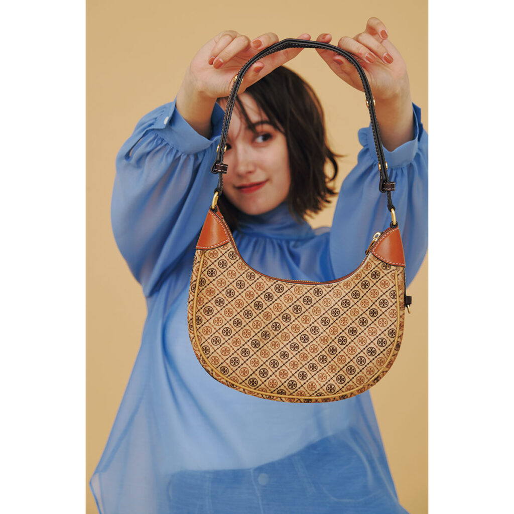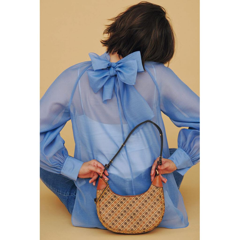小脇に抱えて品よく持つもよし、クロスボディにして、カジュアルに持つもよしなTモノグラムのバッグ。エレガントなブラウスに合わせて、今っぽクラシカルな装いに!バッグ「Tモノグラム クレッセントバッグ」〈H21×W24×D6.5cm〉¥94,600(トリー バーチ ジャパン)ブラウス¥17,930(シップス/シップス インフォメーションセンター)ベアトップ¥4,950(ココ ディール)パンツ¥16,500(ヘルシーデニム/ゲストリスト)