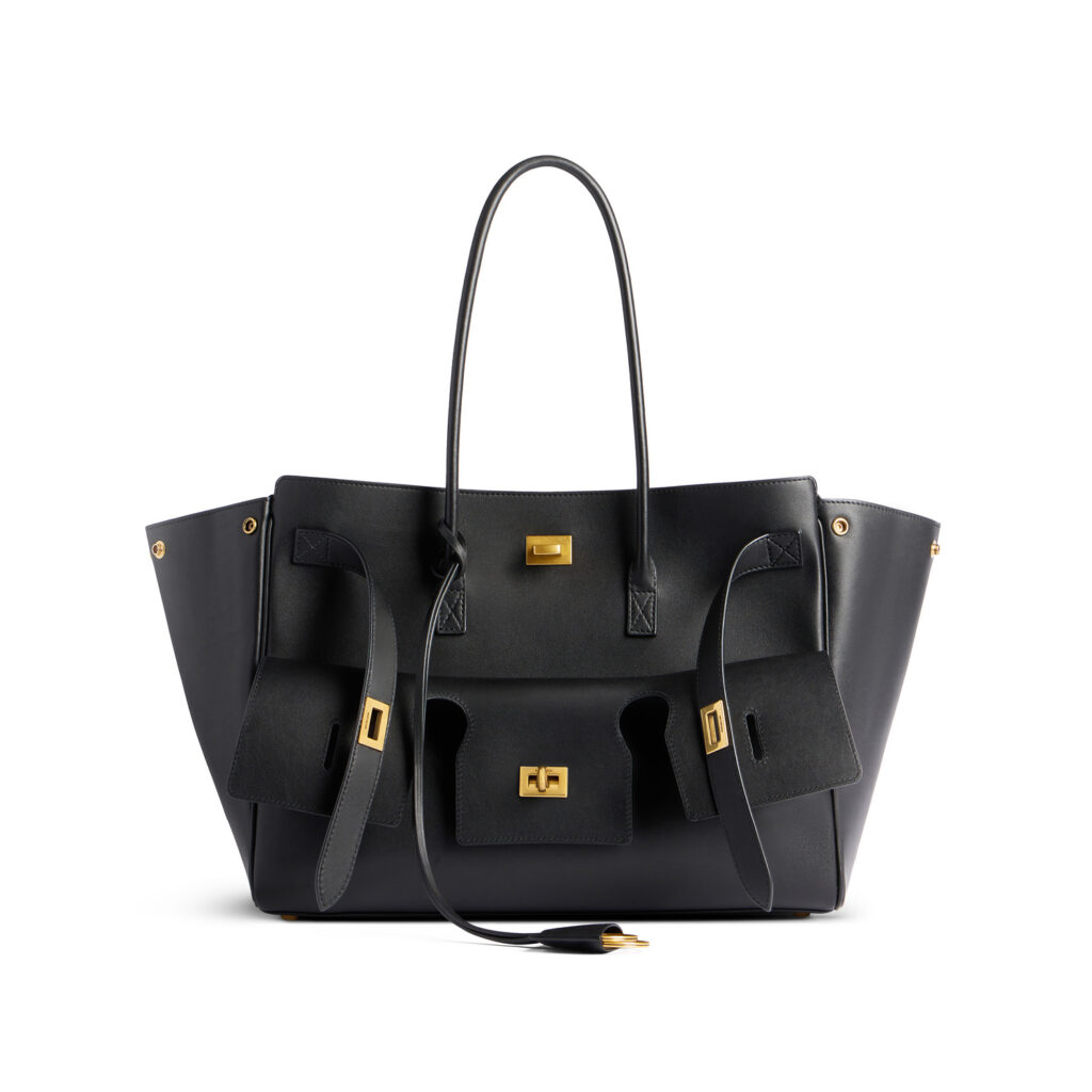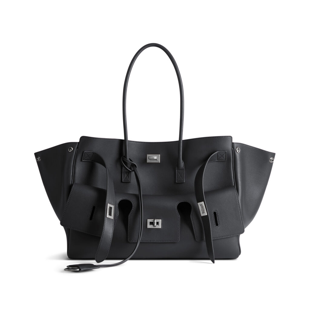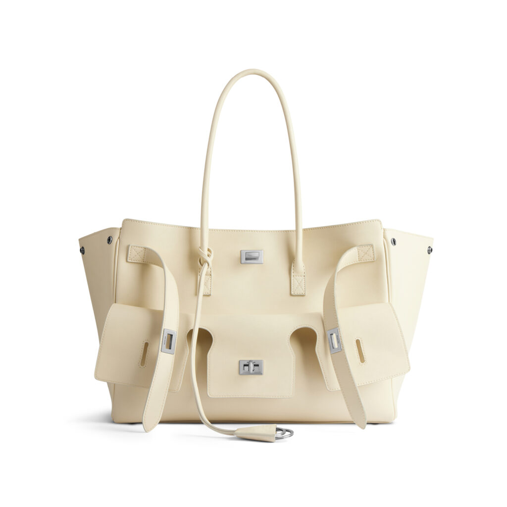 欲しいのは、王道でいて新しさもあるバッグ。ずっと携えていたくなる、なめらかなスムースカーフスキンが映える普遍的なフォルムに、アイコン的存在のチャームで遊び心と個性を添えて。バッグ〈HAMPTON S CARRY ALL BAG/H25.5×W31×D16㎝〉[取り外し可能なストラップ付き、2024年12月発売予定]¥445,500 キーチェーン¥83,600 ドレス¥273,900 ピアス¥145,200 靴¥243,100 ※すべて予定価格(すべてバレンシアガ/バレンシアガ クライアントサービス)