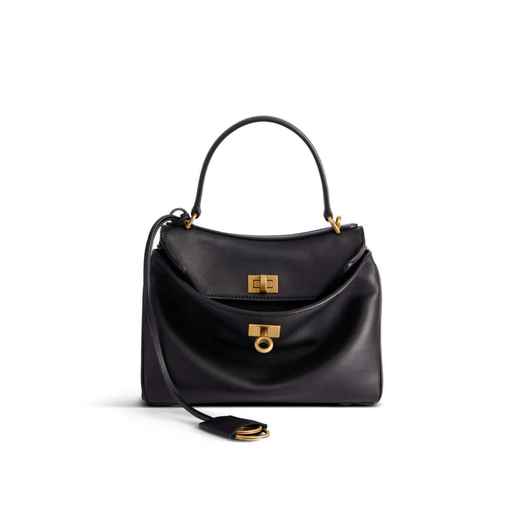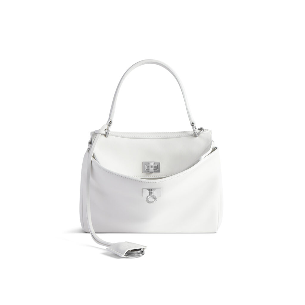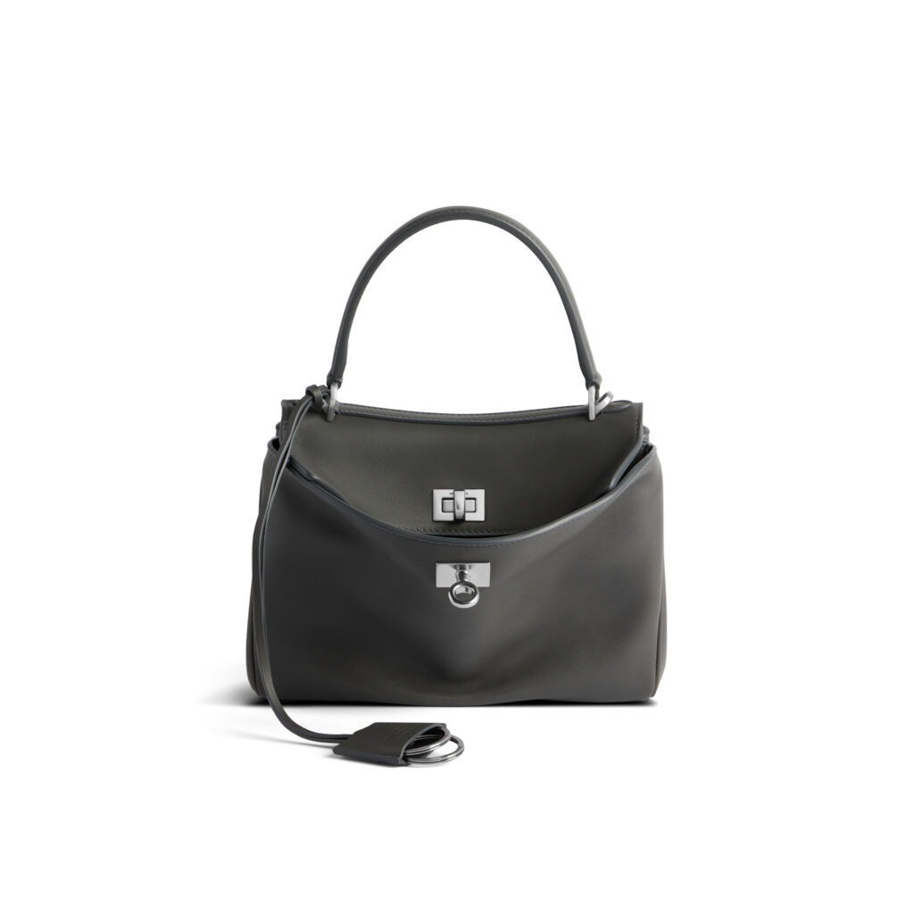 ラグジュアリーとファッションの交差するビバリーヒルズ、ロデオドライブに由来するトップハンドルバッグ。クラシックな佇まいながら、実用性を軸にウィットに富んだディテールが街で目に留まる理由。バッグ〈RODEO MINI HANDBAG/H17×W23×D8.5㎝〉[取り外し可能なストラップ付き]¥435,600 ドレス¥253,000 ピアス¥145,200 3点リングセット各¥126,500のうち2点を着用 靴※参考商品 ※すべて予定価格(すべてバレンシアガ/バレンシアガ クライアントサービス)