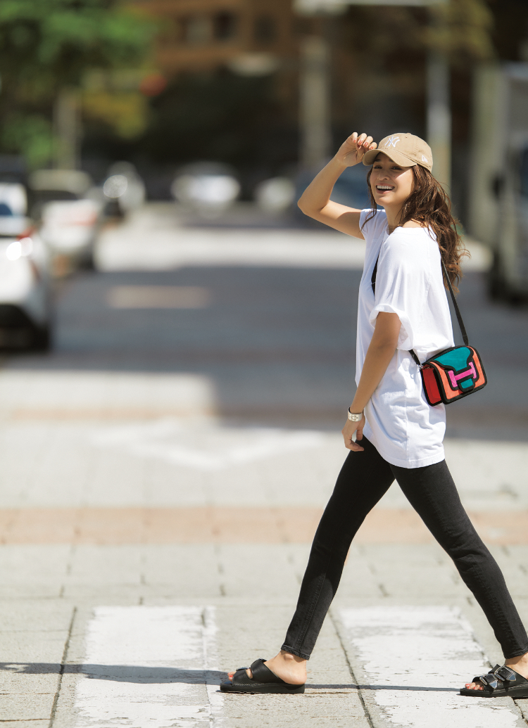 Tシャツ¥9,000(アッパーハイツ/ゲストリスト)パンツ¥23,000(ジョーズ・ジーンズ/エドウイン・カスタマーサービス)帽子¥3,800(ニューエラ)バッグ¥101,000(ピエール アルディ/ピエール アルディ 東京)サンダル¥18,500〈カミナンド〉ピアス¥13,000〈フィリップ オーディベール〉(ともにラヴァンチュール マルティニーク)バングル¥25,000(ノース ワークス/UTS PR)