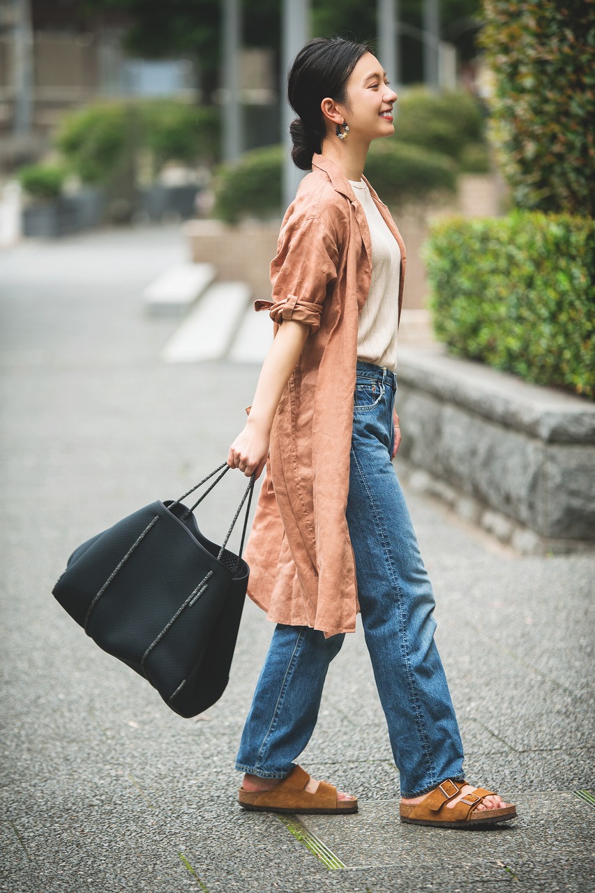 軽くて荷物がたくさん入るのでピラティスのジムに通う時などにヘビロテ中です。「ステートオブエスケープ」のバッグを持つときは、楽ちんだからといって手抜き感が出ないように注意しています。旬の茶系ロングシャツにスポサンでトレンド感を出しつつ、デニムはハイウエストを選んでスタイルアップも狙っています。まとめ髪で顔周りはすっきりさせて、大きめピアスで華やかさも忘れずに添えます。(松田衣里菜さん 商社勤務•29歳)