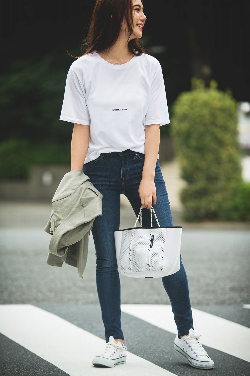 Tシャツ×デニムのカジュアルも小ぶりの白トートできれいめに仕上がります