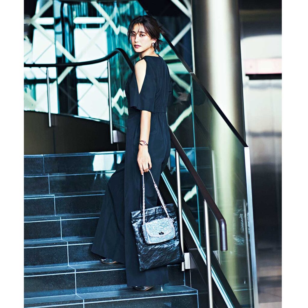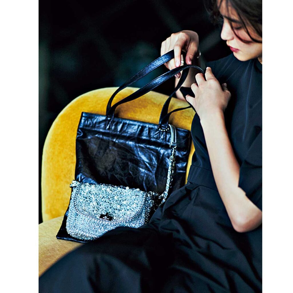 箔加工で上品な光沢あり。アクセサリー感覚のミニバッグのお供に、色も形もベストなサブバッグです。トートバッグ¥13,200ショルダーバッグ¥85,800(ともにアンテプリマ/ワイヤーバッグ/アンテプリマジャパン)オールインワン¥49,500(THIRD MAGAZINE×mikomori/THIRD MAGAZINE)パンプス¥62,700(ネブローニ)イヤリング¥7,700(アビステ)バングル¥74,800(ASAMI FUJIKAWA/ショールーム セッション)