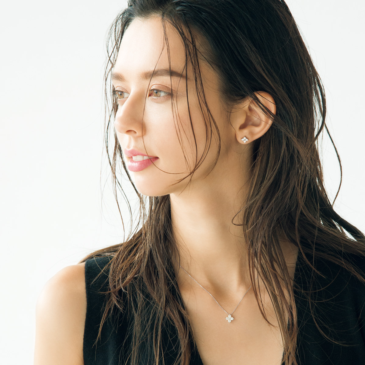 上質な輝きでダイヤモンドの存在感が溢れる、スタージュエリーの名品シリーズのひとつ〝Brightest Star〟。身に着ける人の美しさを引き出す、洗練されたデザインは大人の女性にこそふさわしい。ピアス〈PT950×D〉¥160,000 ネックレス〈PT950×D〉¥175,000(ともにスタージュエリー/スタージュエリー カスタマーサービス)ワンピース¥42,000(ジョン スメドレー/リーミルズ エージェンシー)