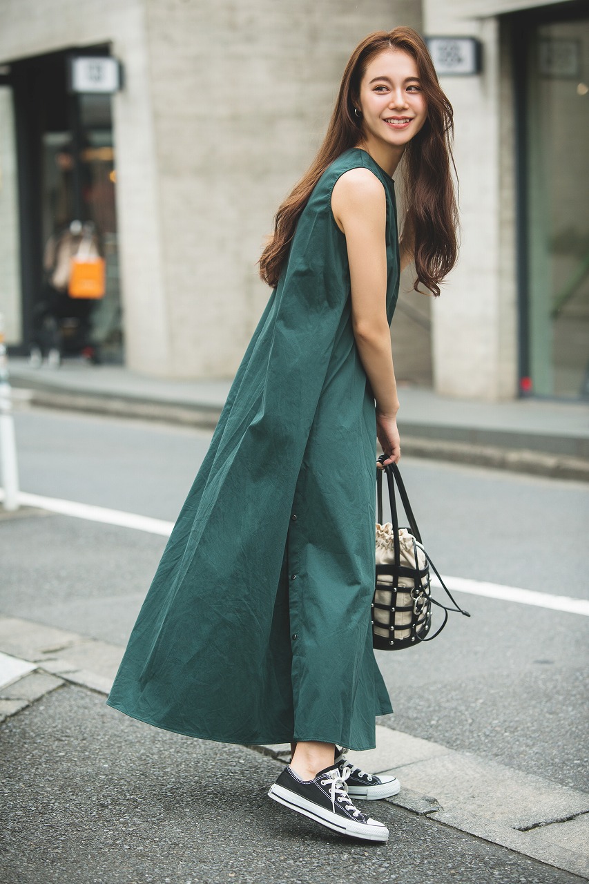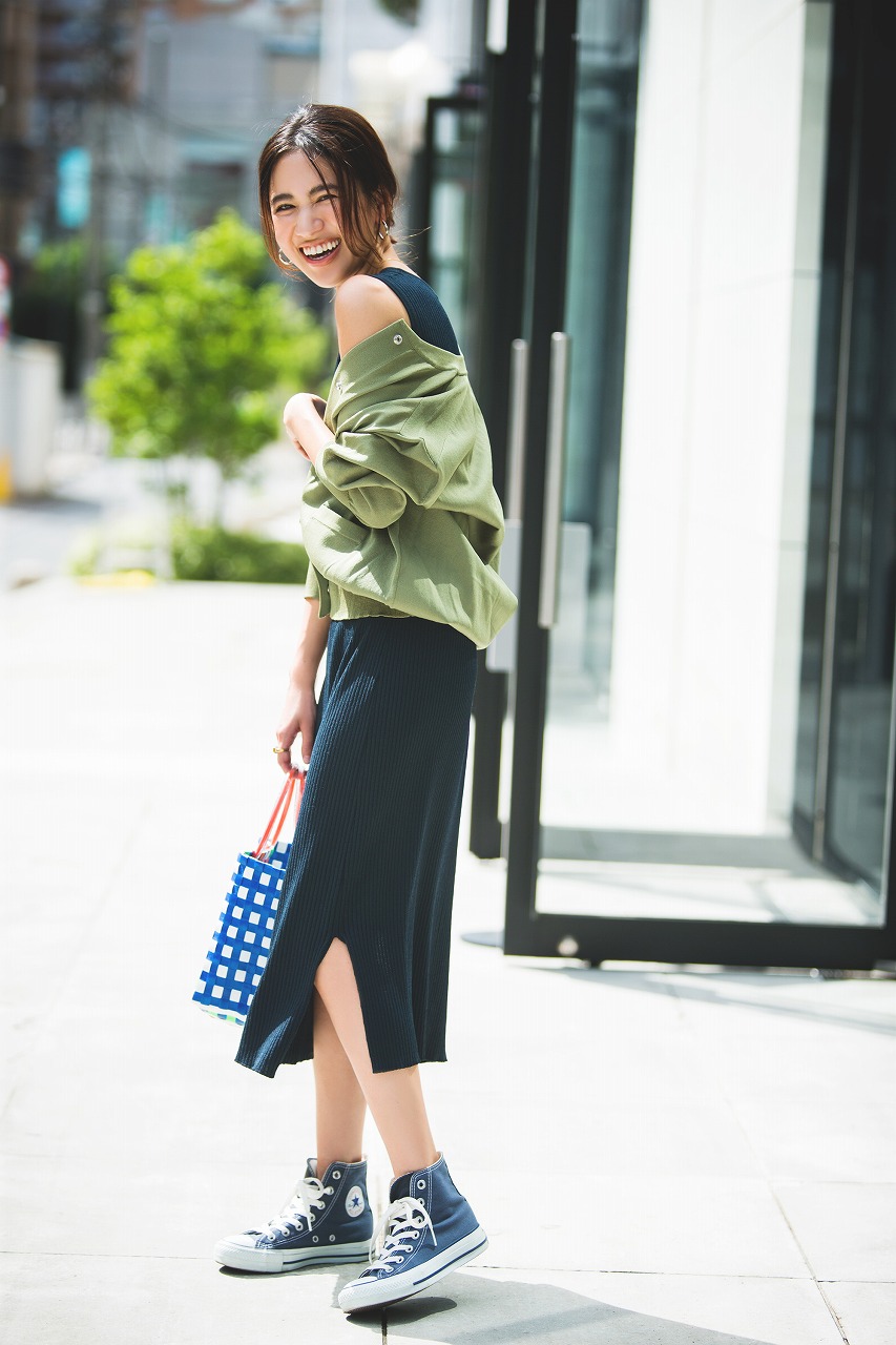 真夏にぴったりのカットソー素材のワンピ×コンバースのスニーカーは、大好きな組み合わせ。カジュアルだからこそ、ちょっと身体のラインが出るタイトなシルエットとスリット入りで女らしいワンピースを選びました。さらにグリーンのリネンシャツを崩して着ることでヌケ感もプラスしたのもポイント。ワンピースと同色のネイビーのハイカットコンバースを選ぶことで、統一感を出したのも大人っぽく見せる秘訣です。(苅谷純子さん 商社勤務•30歳 157㎝)