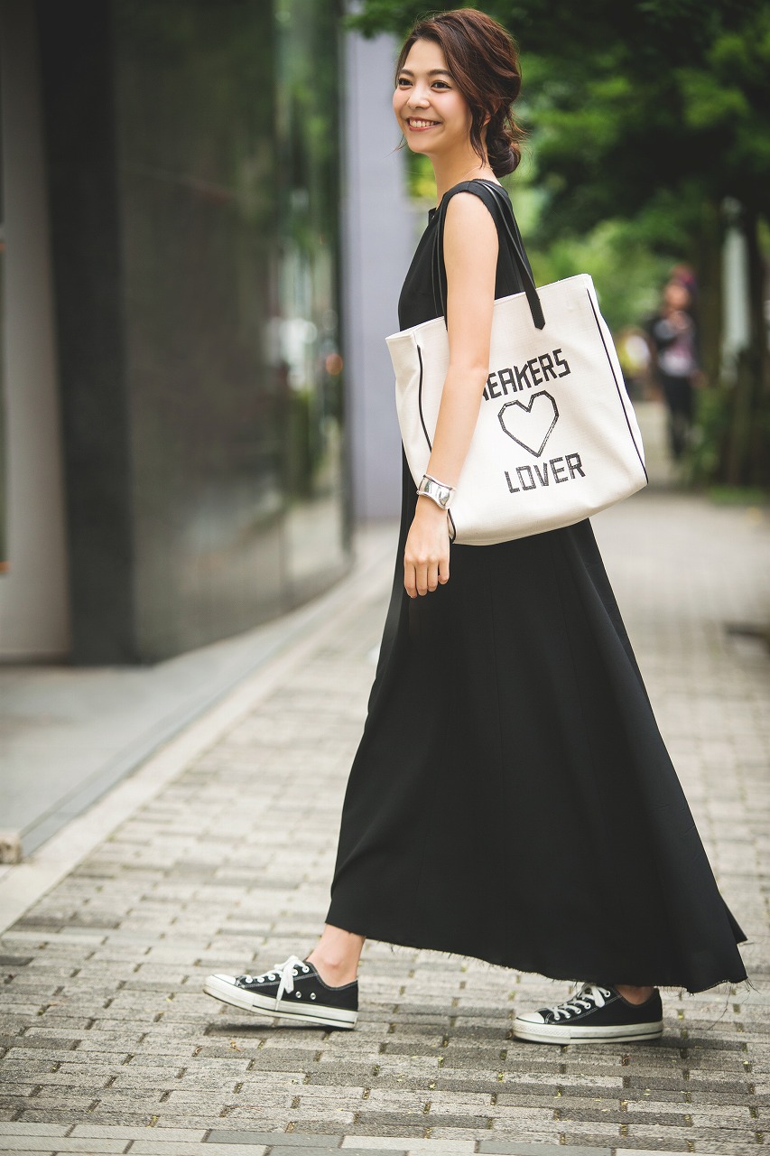 黒コンバースはコンサバ見えするワンピのハズしとしてぴったりです