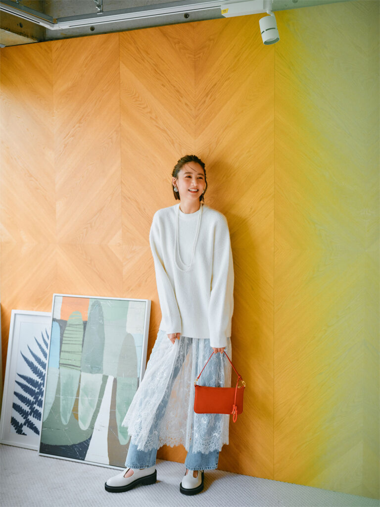 ニットレーススカートセット¥18,920ブーツカットデニム¥9,900ショルダーバッグ¥11,000T ストラップローファー¥13,970イヤリング¥5,720ネックレス¥5,940(すべてミラ オーウェン/ミラ オーウェン ルミネ新宿2店)