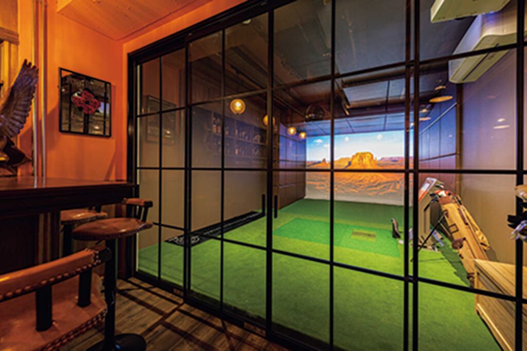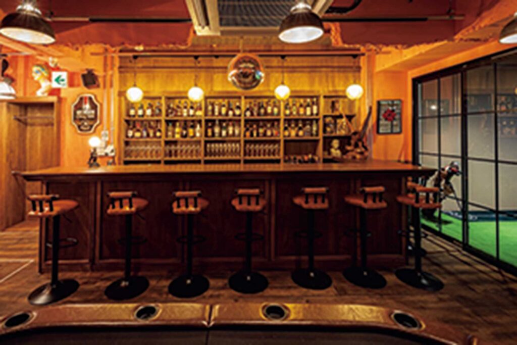 隠れ家のようなアメリカンヴィンテージとキューバテイストのバーの奥に、シミュレーションゴルフのレンジが。お酒を楽しみながら気軽にゴルフができる。