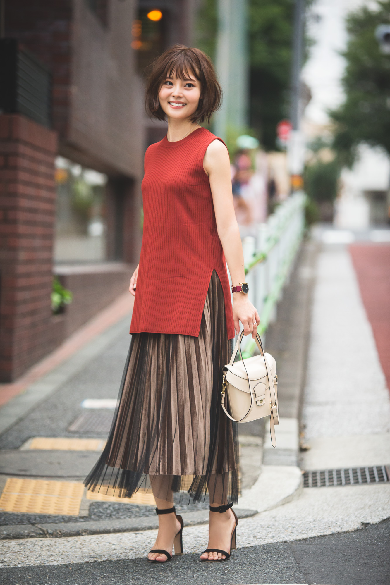 ブラウンは真夏のスタイルに取り入れるだけで即オシャレになるのでお気に入りのカラーです。赤身の強いテラコッタのニットにチョコブラウンのプリーツスカートで秋を意識したスタイルに。全体が重たく見えないようにオフホワイトのバッグとヌーディサンダルで、ヌケ感を意識したのもポイントです。(梅澤ひかりさん メーカー関係 30歳 165cm)