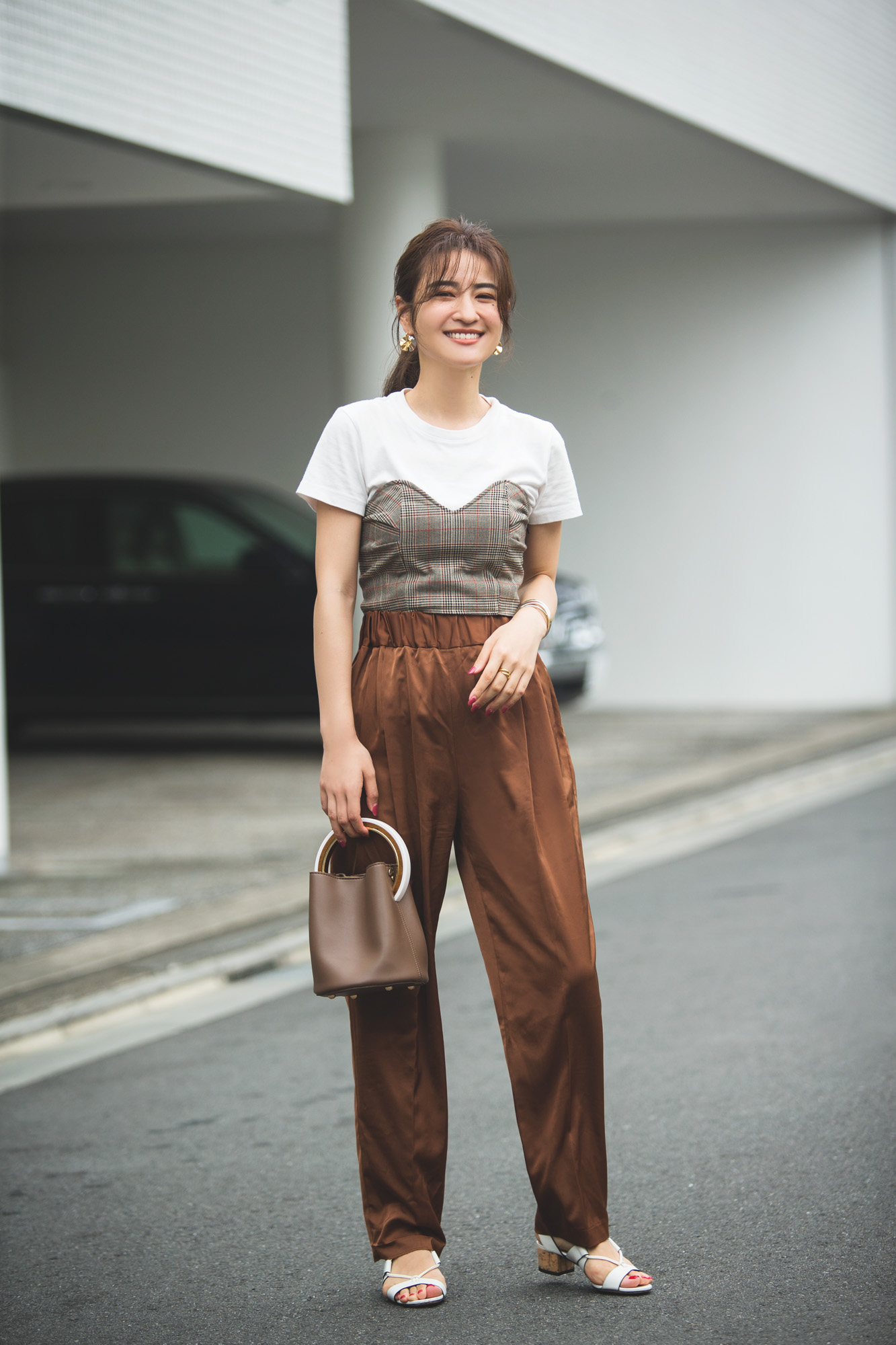 サテンのパンツは着心地がラクチンなのに、光沢とブラウンの色味できちんと感が出るので休日コーデに重宝しています。真夏はTシャツ&パンツで楽しみつつ、秋はじめはチェック柄のビスチェを重ねてオシャレに遊び心をプラス。バッグも茶系でまとめつつ、足元は重たくならないように低めヒールの白サンダルを合わせました。(中瀬古ゆきなさん PR関係 26歳 165cm)