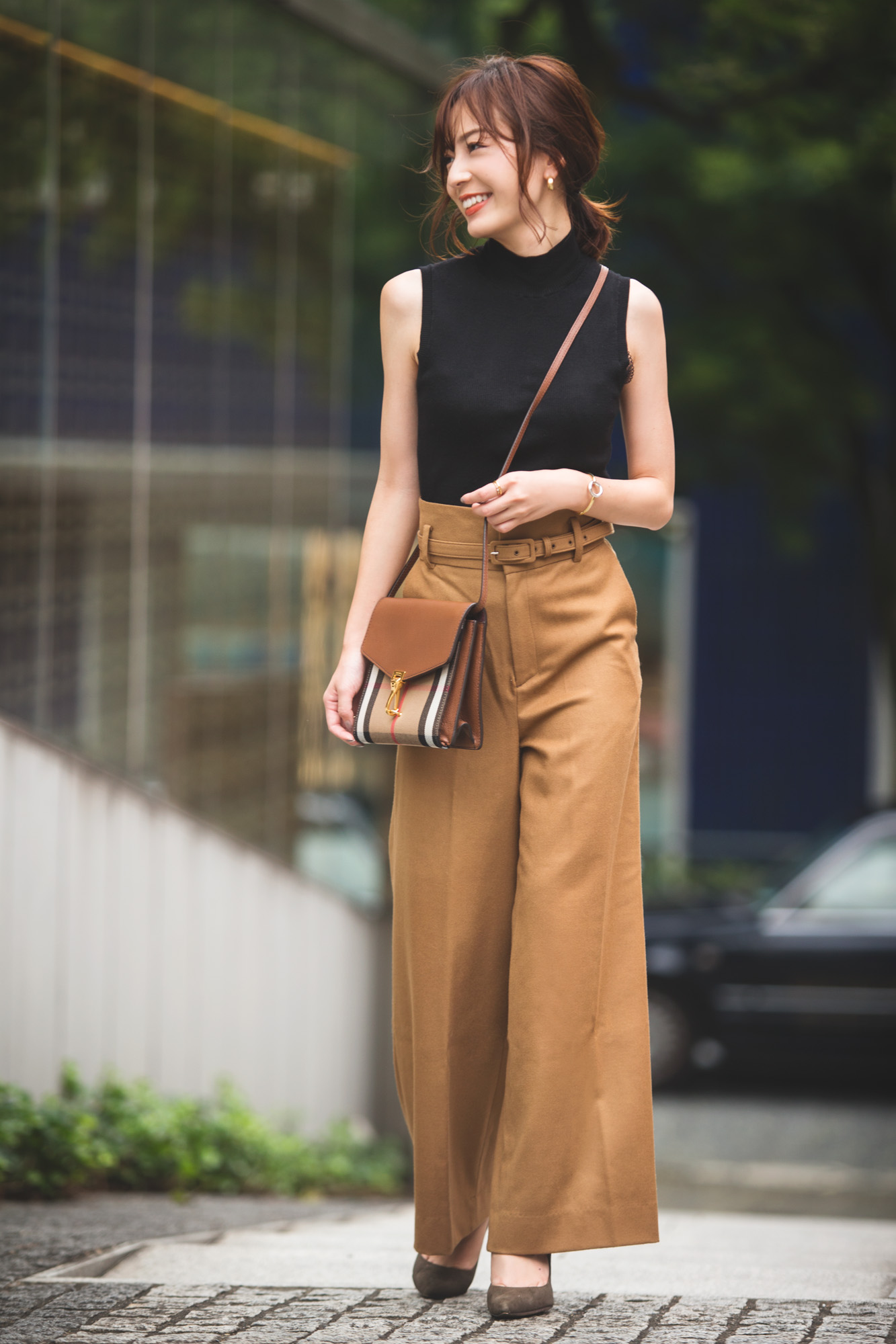 背が低めなのでバランスや子供っぽく見えないに気をつけているんですが、ブラウンはそれだけで大人っぽい印象があるので便利です。特にワイドパンツで取り入れればたちまち知的な印象に。黒のノースリーブをボトムスインしたり、グレージュのヒールパンプスで足元をなじませてスタイル良く見せています。仕上げにバッグを斜めがけしてほんのりカジュアル感もプラスしました。(中村麻美さん アパレル関連勤務 24歳 154cm)