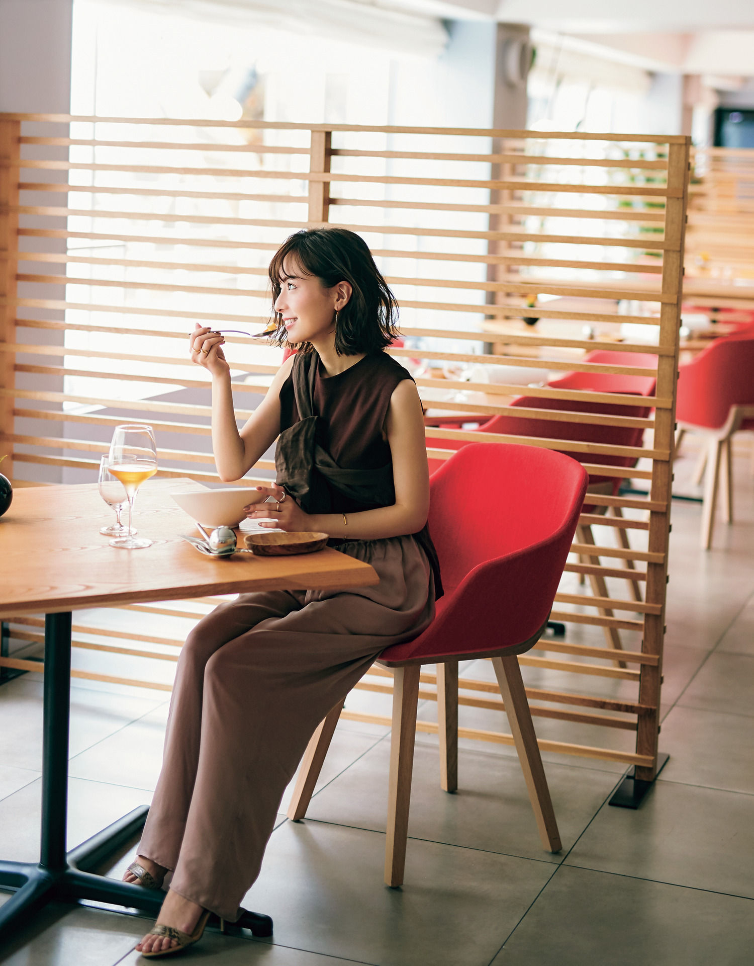 コーディネートになじむ茶系の小さめバッグは通勤にも大活躍です
