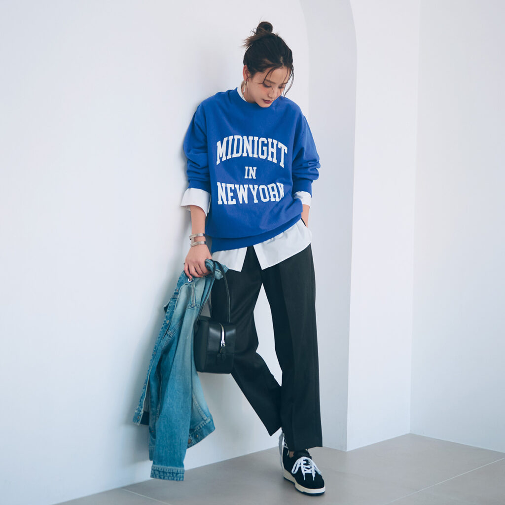 メンズっぽいカジュアルも、白シャツのレイヤードやレザーのバッグで大人っぽさをキープ。スウェット¥11,000(ジャーナル スタンダード/ジャーナル スタンダード 自由が丘店)シャツ¥13,200(N.O.R.C/ノーク)デニムジャケット¥39,600(サンディニスタ/トゥー・ステップ) パンツ¥18,700(イエナ/ル ドーム イエナ 丸の内店)バングル¥64,900(アダワットトゥアレグ/ザ エディット ストア)ピアス¥4,620(アビステ)スニーカー[ポップアップ限定]¥36,300(デイト/ティースクエア プレスルーム)バッグ¥86,900(メゾン カナウ/ヤマニ)