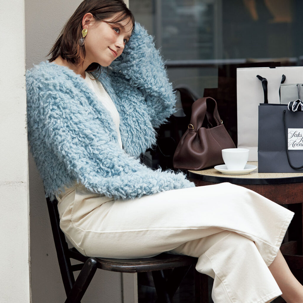 今季注目の短丈×きれい色アウターでトレンドを先取り!爽やかなブルーが白のワントーンコーデに映えます。ニットカーディガン¥15,400(FRAY I.D/FRAY I.D ルミネ新宿2店)ニット¥55,000(ババコ/ショールームリンクス)デニム¥19,800(Ungrid)バッグ¥73,000ピアス¥35,000(ともにポレーヌ/ポレーヌ カスタマーサービス)