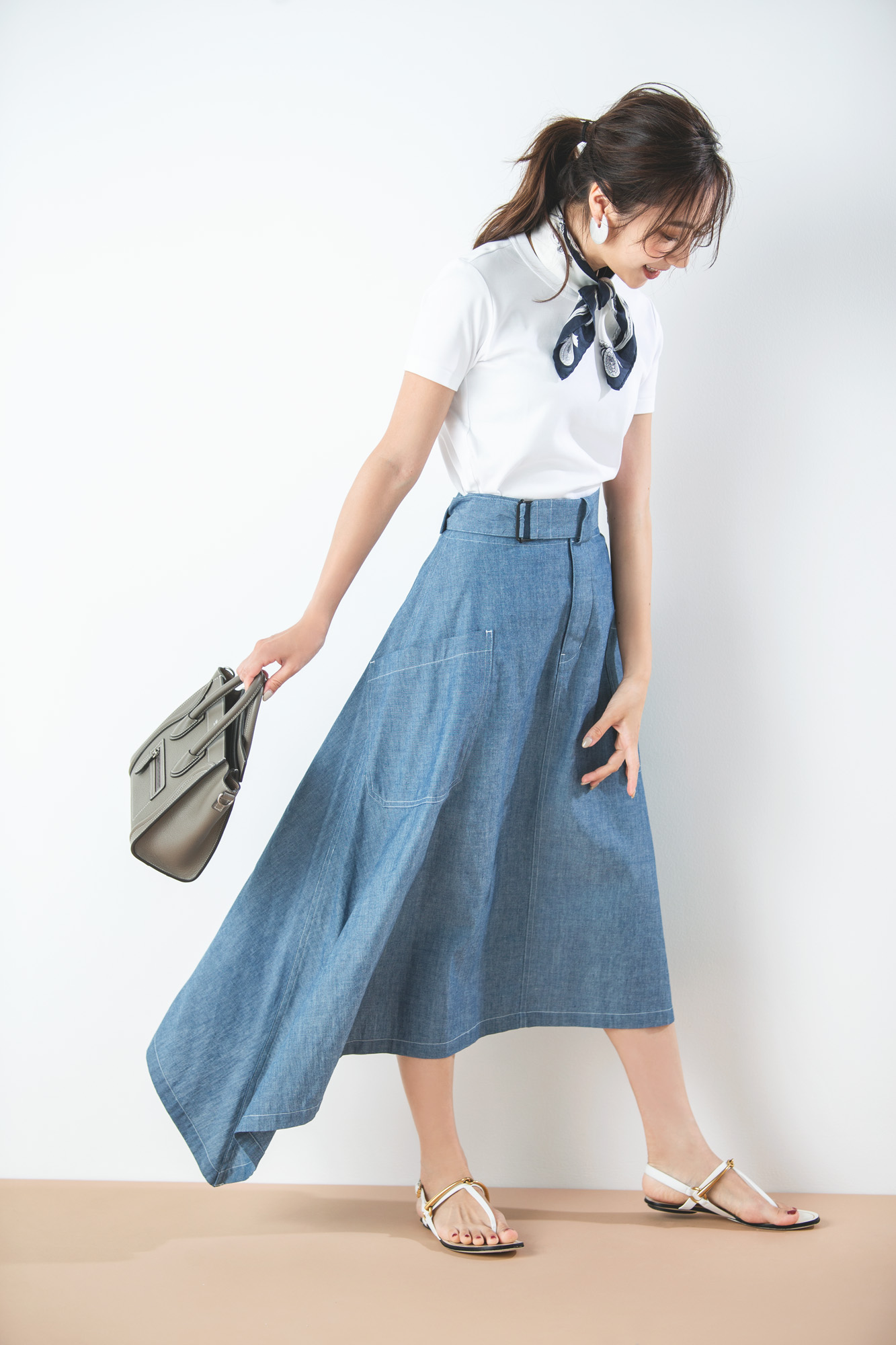 フレアスカートはハリのあるダンガリースカートなら甘くならずにスタイルアップできます。アシンメトリーでちょっぴりモード感も出るし、ハイウエスト&太いウエストベルト付きなのでインスタイルがすっきり、シンプルなTシャツと合わせて着るだけで全体がキレイに決まります。