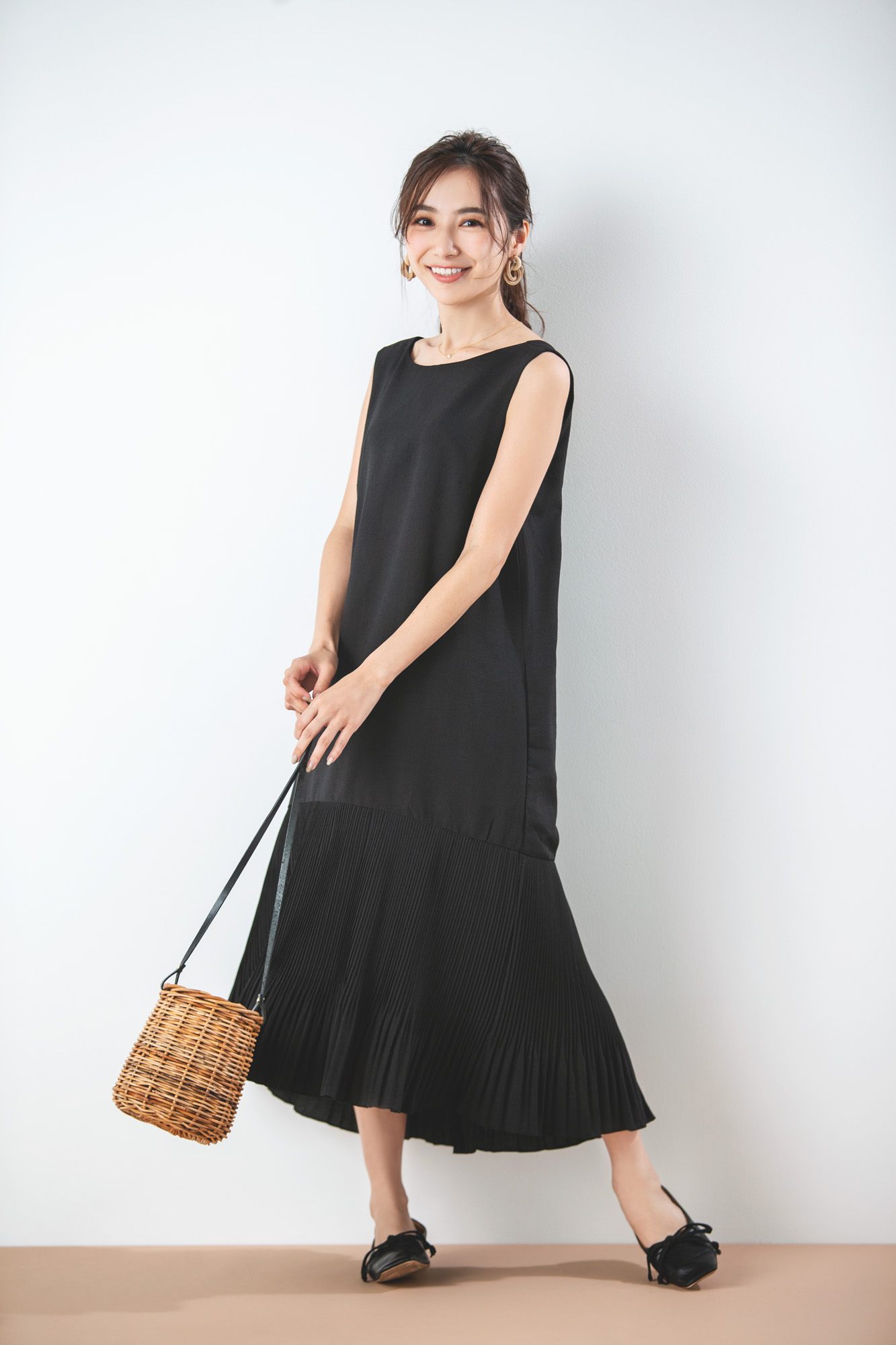 低めの切り替えでと裾がひらっと可愛いのに全体の印象は甘すぎず、背中のVカットもシャープな印象になるのでお気に入りです。ここのブランドはサイズ表記がきちんとしているので、ネットでも買いやすいんです。すっきりまとめたヘアに小ぶりのカゴバッグ、スクエアバレエシューズでトレンド感もさりげなく演出しました。
