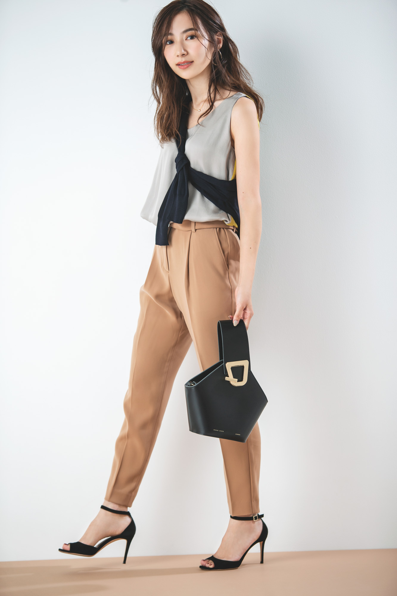 きれいめコーデに挑戦したい時はセンタープレスのハイウエストパンツが一本あれば解決です。ハイウエストで腰の位置を高く見せ、センタープレス効果で脚長効果が。足元はヌーディなデザインのサンダルで印象を引き締めて。テロンとオチ感のある素材感やベージュ〜茶系の色使いを選ぶのも大人っぽく見せるポイントです。