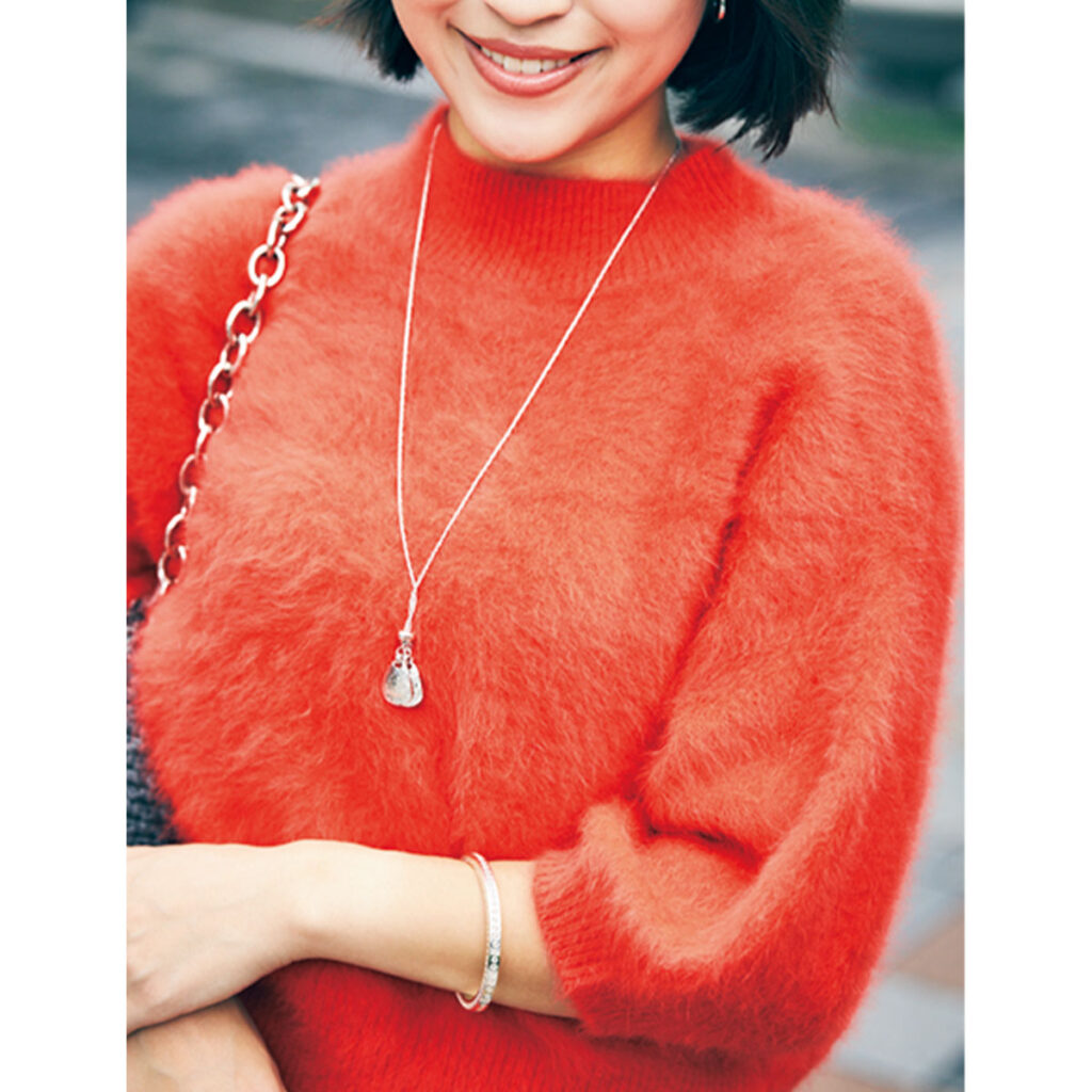 現代の女性に向けた、エストネーションオリジナルブランド。スーパーロング袖には指穴付き。カシミヤ混で肌触りも格別です。スヌードを外して、シンプルなVネックニットとしても使えるマルチウェイ仕様。スヌード付きニット¥63,800パンツ¥88,000(ともにコラム/エストネーション)バッグ¥44,000(ラシット/ラシット 西銀座店)ピアス¥4,400(AKTE)