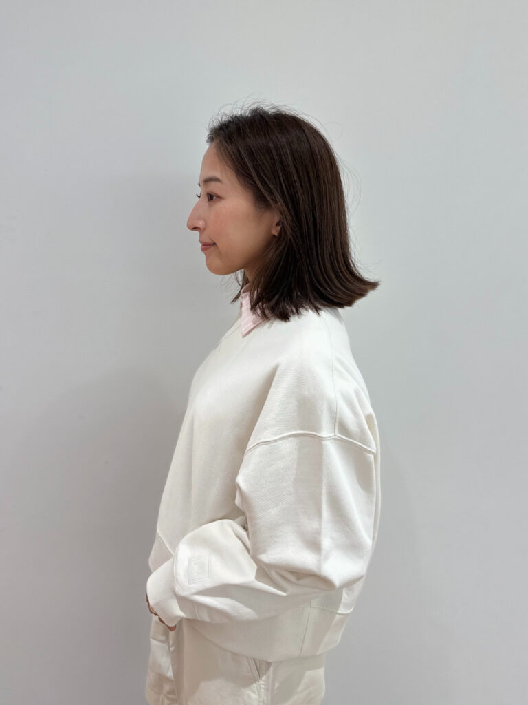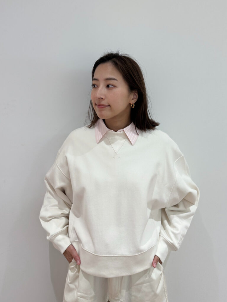 差し色アイテムとして取り入れやすい短丈シャツは、春こそ思い切ってピンクをチョイス!スウェットの肩掛けで色面積を減らすことで、着こなしの難易度も下がります。他はホワイトで色味を抑え、チノでほどよくカジュアルダウン。