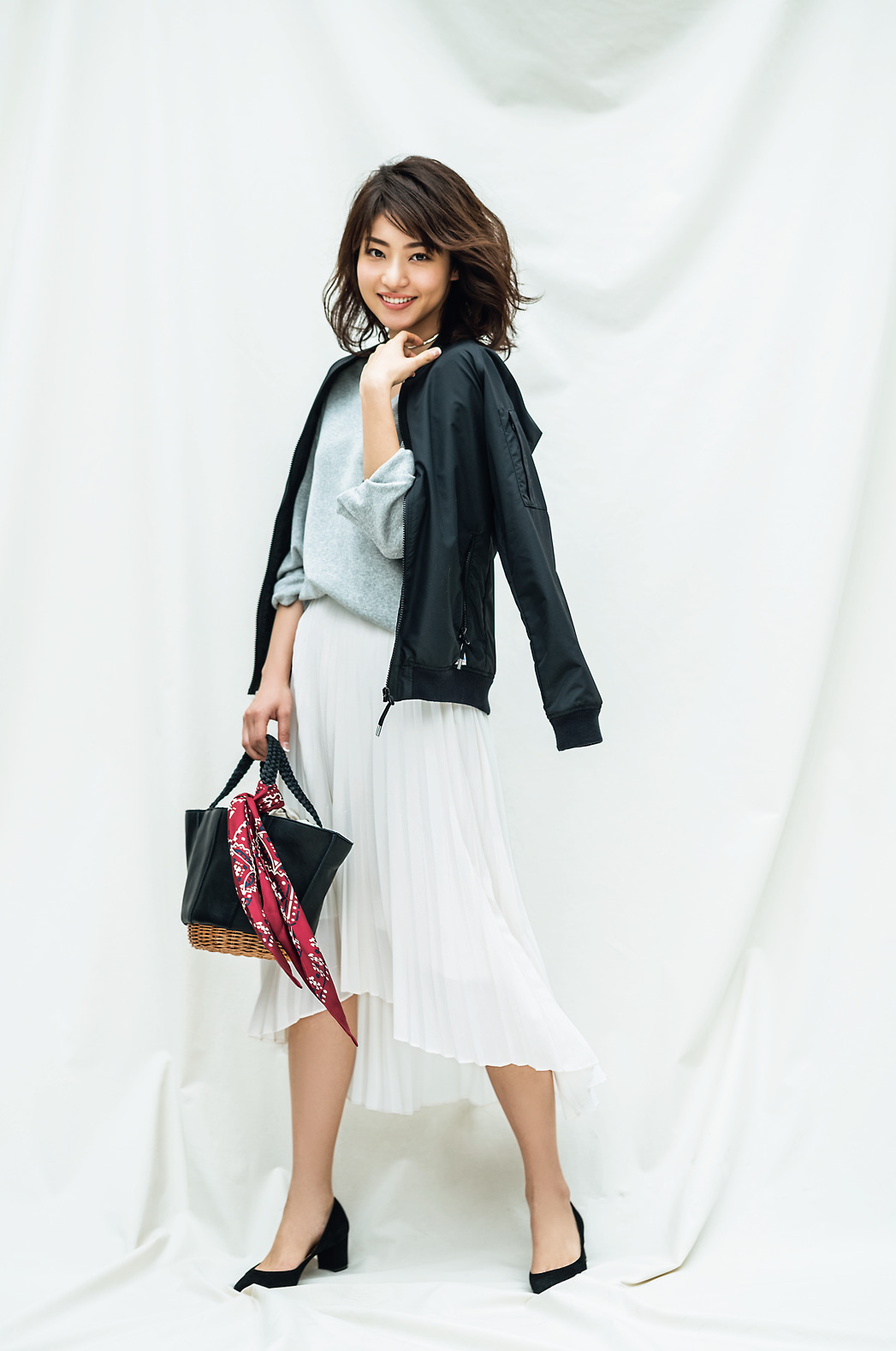 ブルゾン¥22,000(ケープハイツ/グリニッジ ショールーム)ニット〈2月下旬発売予定〉¥18,000(NATURALBEAUTY)スカート¥16,000(ノーリーズソフィー/ノーリーズソフィー品川店)パンプス¥34,000(EXTRAORDINARY JANE/ショールーム セッション)バッグ¥17,000(イコット/シップス 有楽町店)バッグに付けたスカーフ¥18,000(マニプリ/フラッパーズ)チョーカー¥42,000(プリュイ/ストローラーPR)