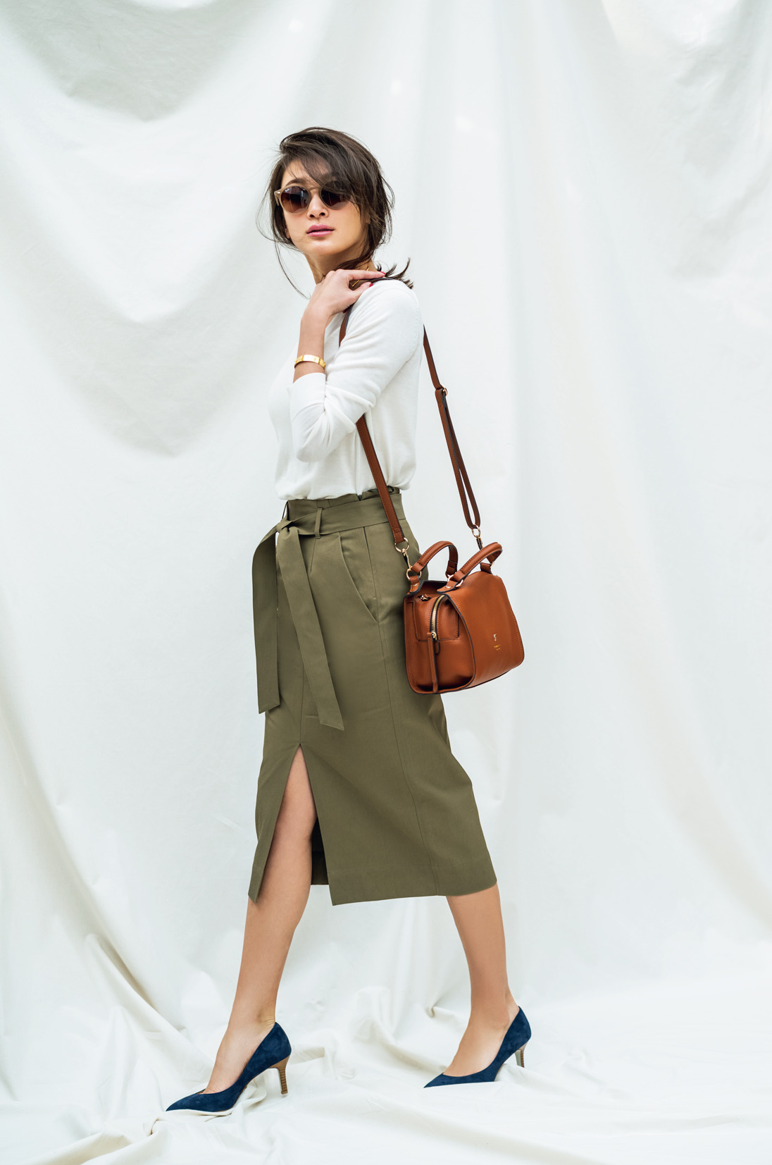 体にメリハリのあるストレートタイプは、タイトスカートがよく似合います。トップスをINするのが今季流。