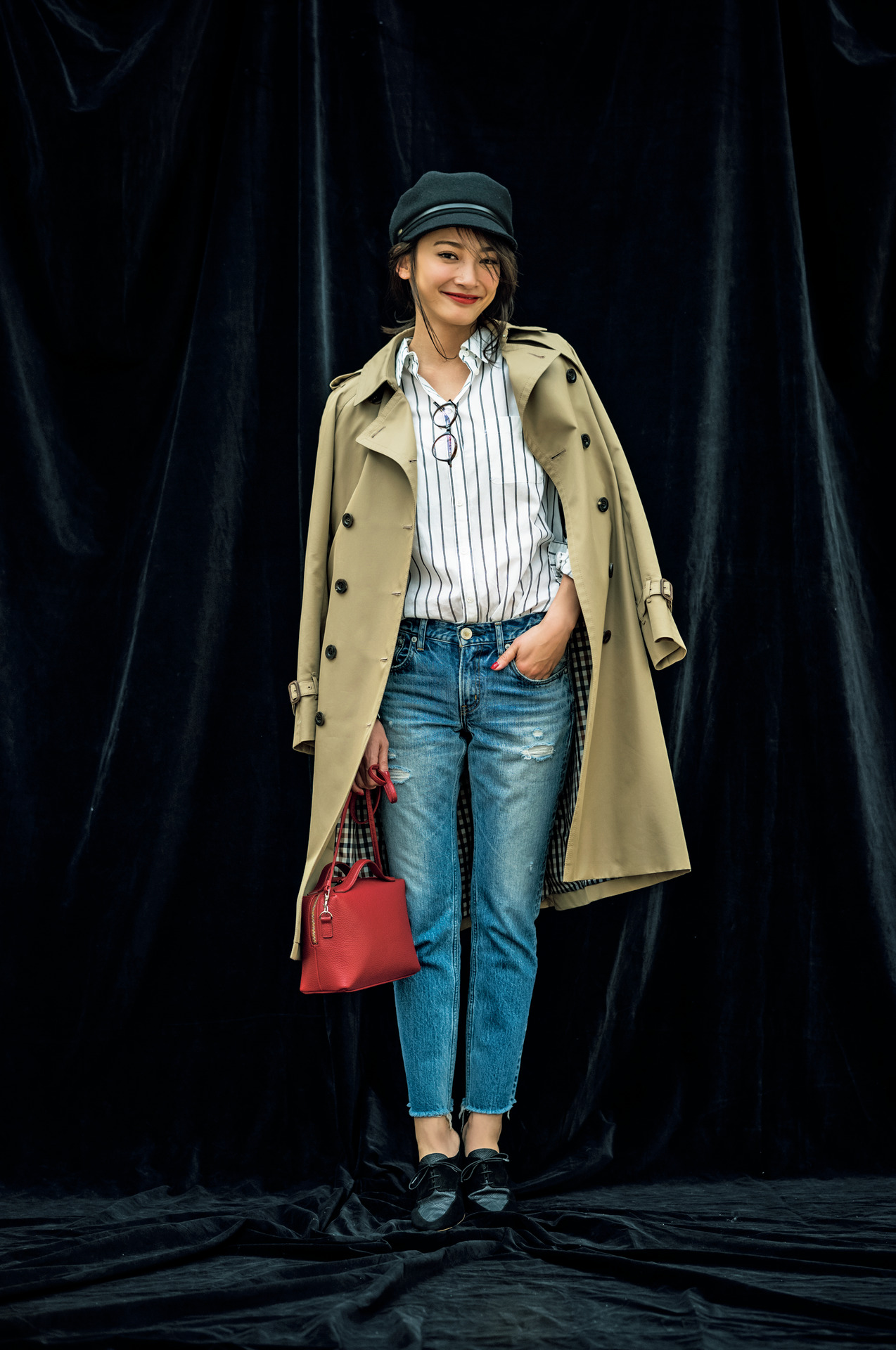 トレンチコート¥130,000(アクアスキュータム/レナウン プレスポート)シャツ¥29,000(エキップモン/サザビーリーグ)デニムパンツ¥26,000(レッドカード/ゲストリスト)バッグ¥43,000(BELLMER/FUN Inc.)シューズ¥23,000(アグ®/デッカーズジャパン)帽子¥6,800(CA4LA/CA4LA ショールーム)めがね¥26,000(プロポ/プロポデザイン)