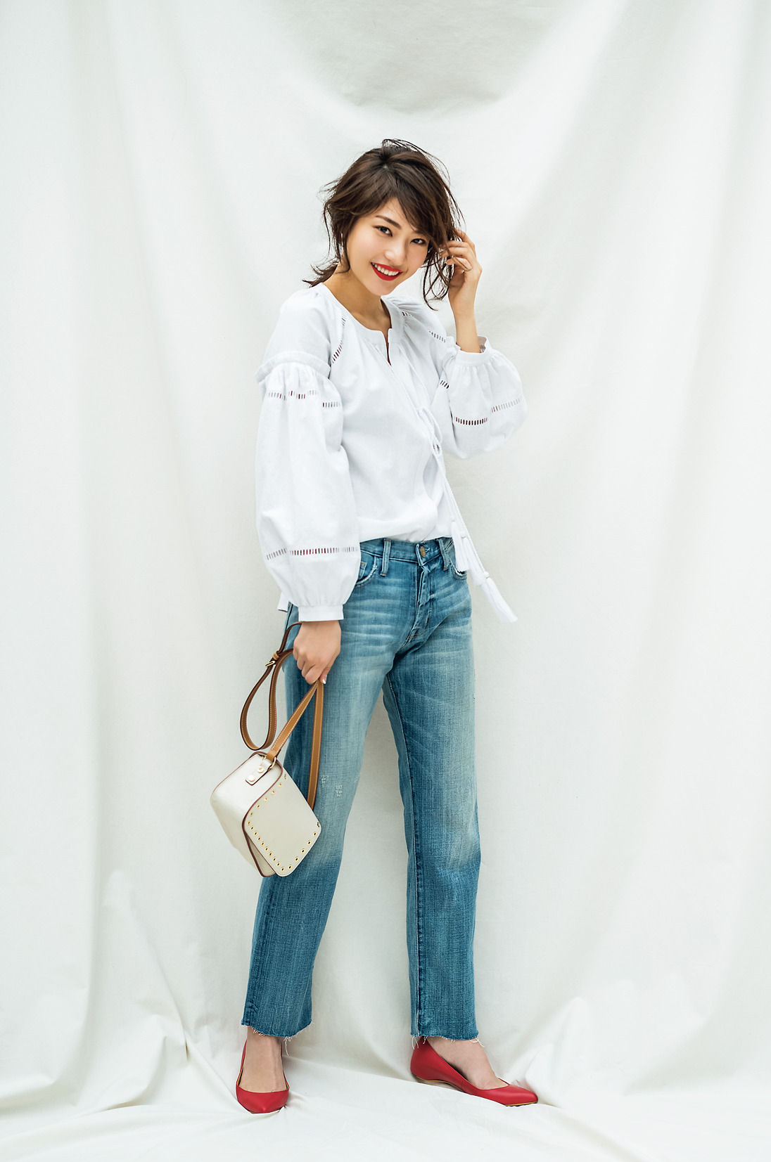 ブラウス¥19,000(ダブルスタンダードクロージング/フィルム)デニムパンツ¥33,000(カレント エリオット/サザビーリーグ)バッグ¥26,800(イアクッチ/シップス 有楽町店)パンプス¥29,000(CHEMBUR/FUN Inc.)