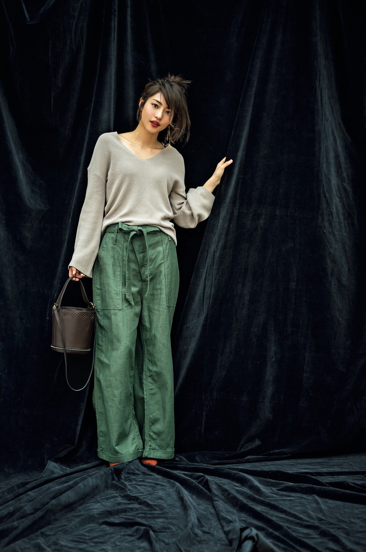 ニット¥17,000(アナカ/ミニョン エアンシェヌマン ルミネ有楽町店)パンツ¥23,000(ジェーン スミス/メゾンイエナ)バッグ¥64,000(ダニエル&ボブ/八木通商)パンプス¥26,000(ツル バイ マリコ オイカワ)ピアス¥27,000(LARA BOHINC/H.P.FRANCE)