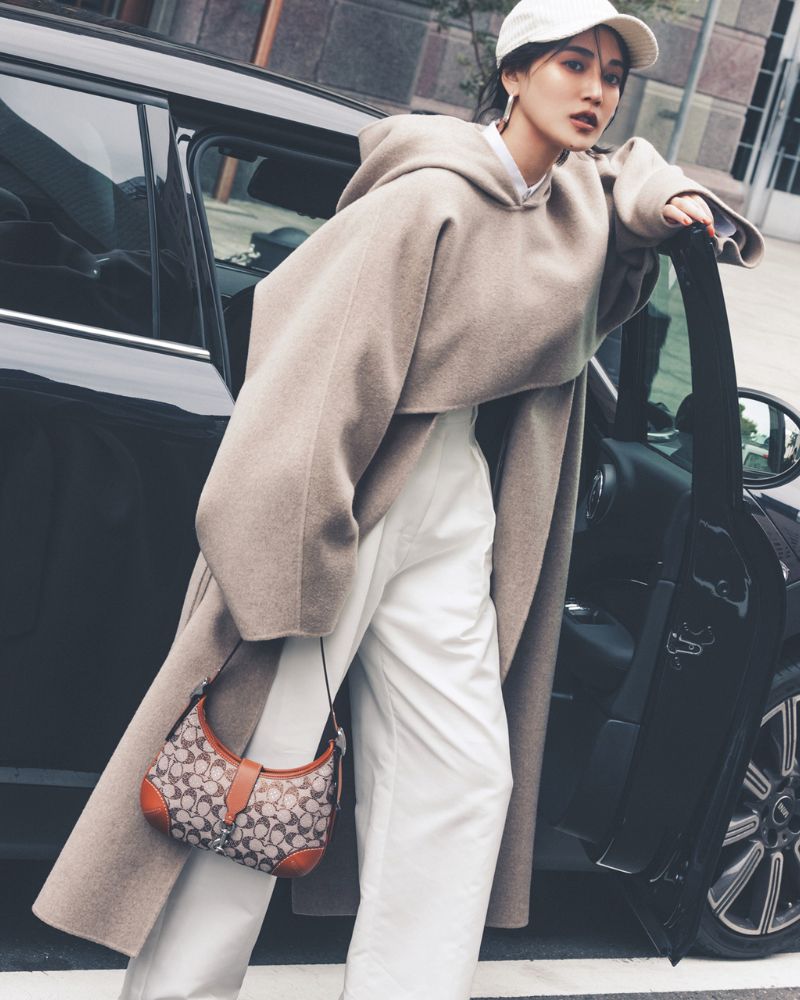 バッグ【ハンプトンズ ホーボー バッグ クリスタル シグネチャー ジャカード】¥69,300(コーチ/コーチ•カスタマーサービス • ジャパン)ロングコート¥79,200 ケープ¥59,400(ともにコンテ/コンテ 青山店)シャツ¥27,500(ロエフ/エイチ ビューティー&ユース)パンツ¥28,600(セテンス)キャップ¥28,600(ボルサリーノ/中央帽子)ピアス¥17,600(ワンエーアールバイウノアエレ/ウノアエレ ジャパン)