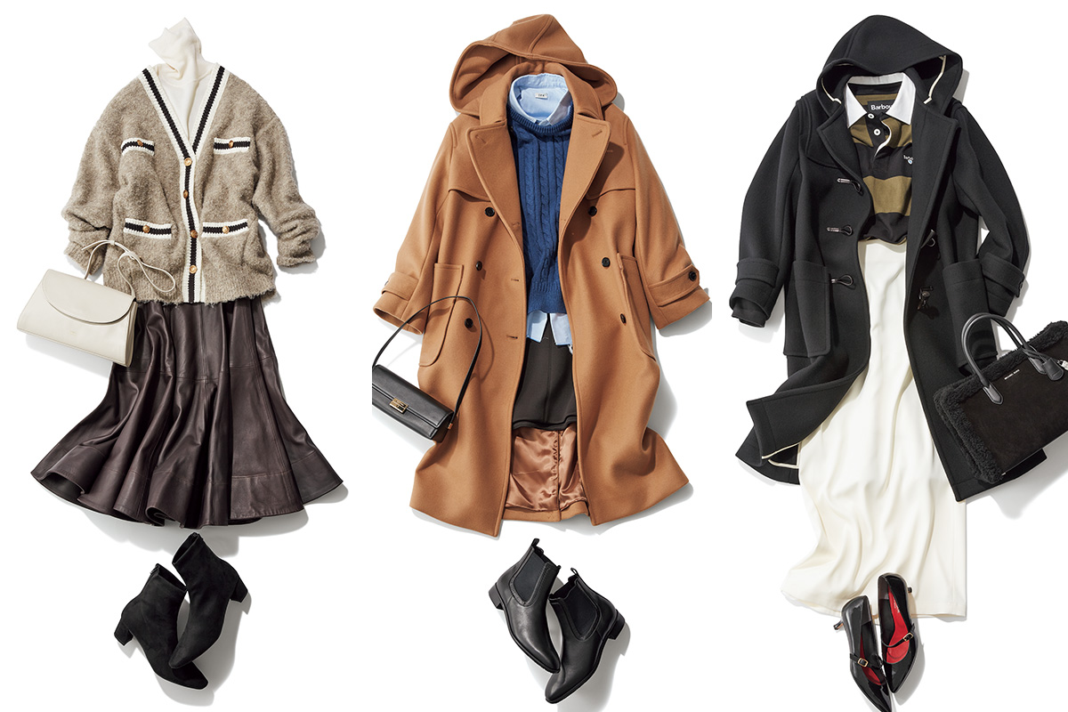 ケーブルニットはカラーで印象チェンジ。ボトムスはミニ〜半端丈を選んで、ほっこり見えを回避して。ケーブルニット¥13,200(デッサン/ワールド プレスインフォメーション)コート¥49,000(COS/COS 青山店)中のシャツ¥35,200(シー/エスストア)スカート¥10,780(スナイデル/スナイデル ルミネ新宿2店)バッグ¥57,200(マイケル マイケル・コース/マイケル・コース カスタマーサービス)ブーツ¥25,300(ダイアナ/ダイアナ 銀座本店)