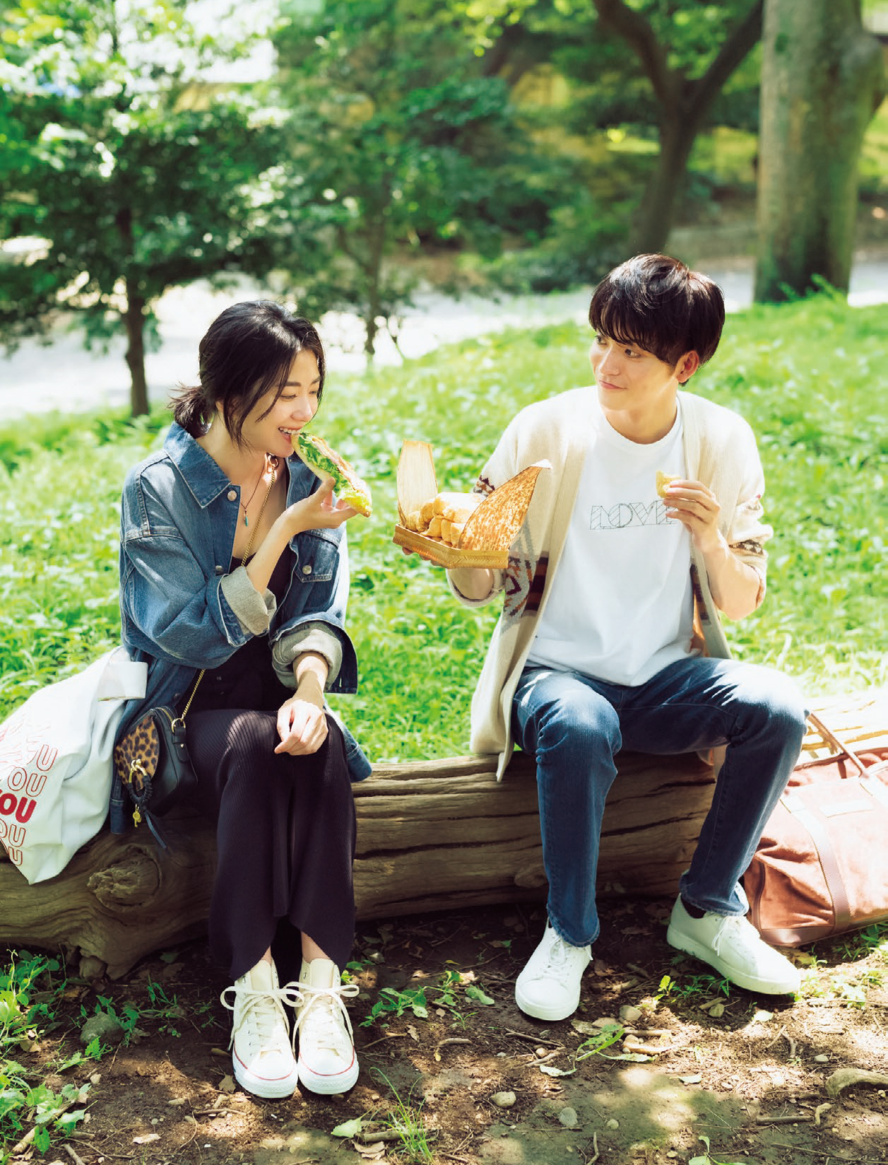 ショルダーバッグ¥42,000(シーバイクロエ/クロエ カスタマーリレーションズ)トートバッグ¥120,000(ゲラーレ ミズラヒ/エイチ ビューティ&ユース)スニーカー¥5,800(コンバース/コンバースインフォメーションセンター)ネックレス¥56,000(ミズキ/RHC ロンハーマン)【山本くん】カーディガン¥14,000 Tシャツ¥5,500(ともにティーケータケオキクチ)パンツ¥34,000(エージー/エージー ジャパン)シューズ¥69,000(サントー二/リエート)バッグ¥120,000(フェリージ/フィーゴ)